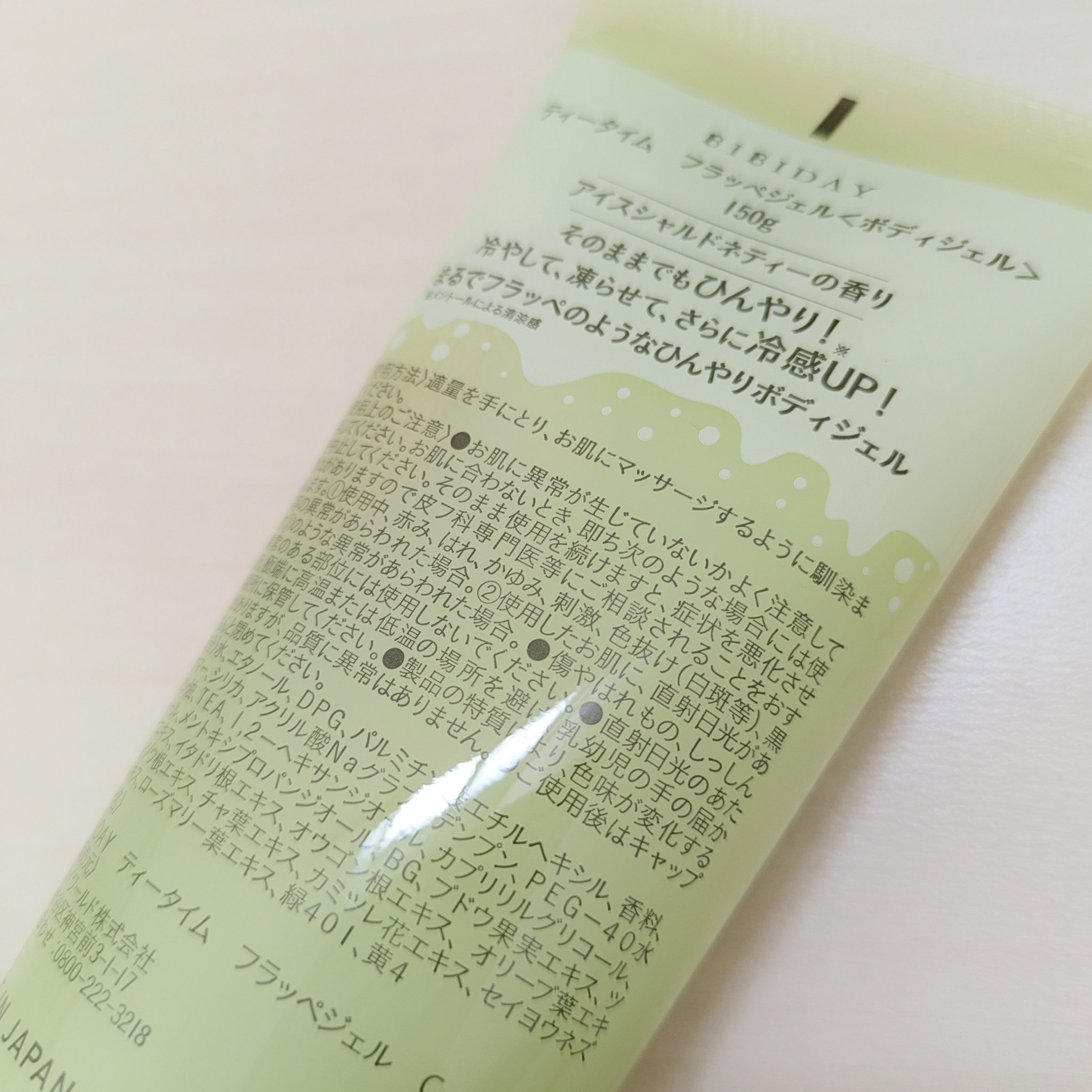 BIBIDAYTEATIMEフラッペジェルアイスシャルドネティー蒸し暑い日が続いていてボディケアも夏仕様に変えたい今日この頃。そんな方にもおすすめのボディージェル!そのままでも、冷やしても、なんと冷凍庫で凍らせて使うのもOKなんだそう!香りは...