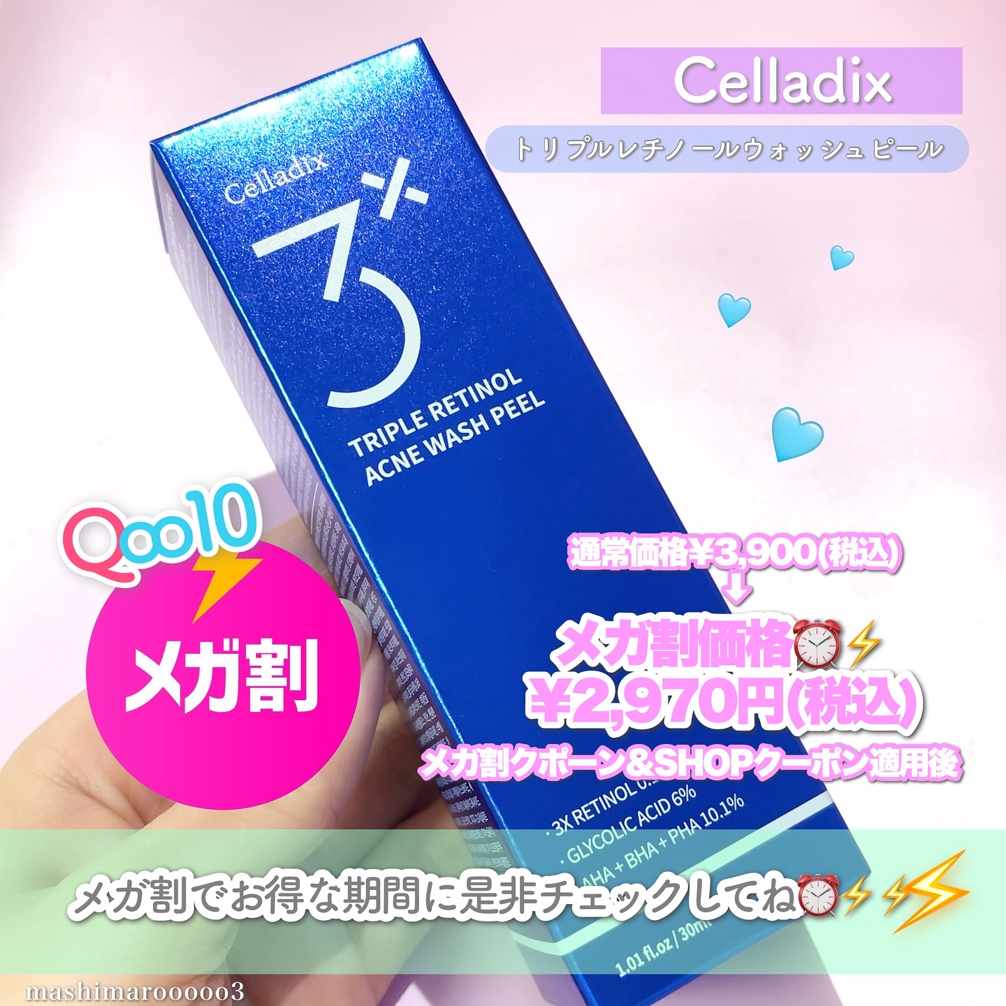 \話題の洗い流すレチノール美容液/Celladix(セラディックス)のトリプルレチノールウォッシュピールがQoo10メガ割で3,900円(税込)→2,970円(税込)になるよ!少し黄色みがかったとろっとしてテクスチャー。使い方は、洗顔後、乾い...