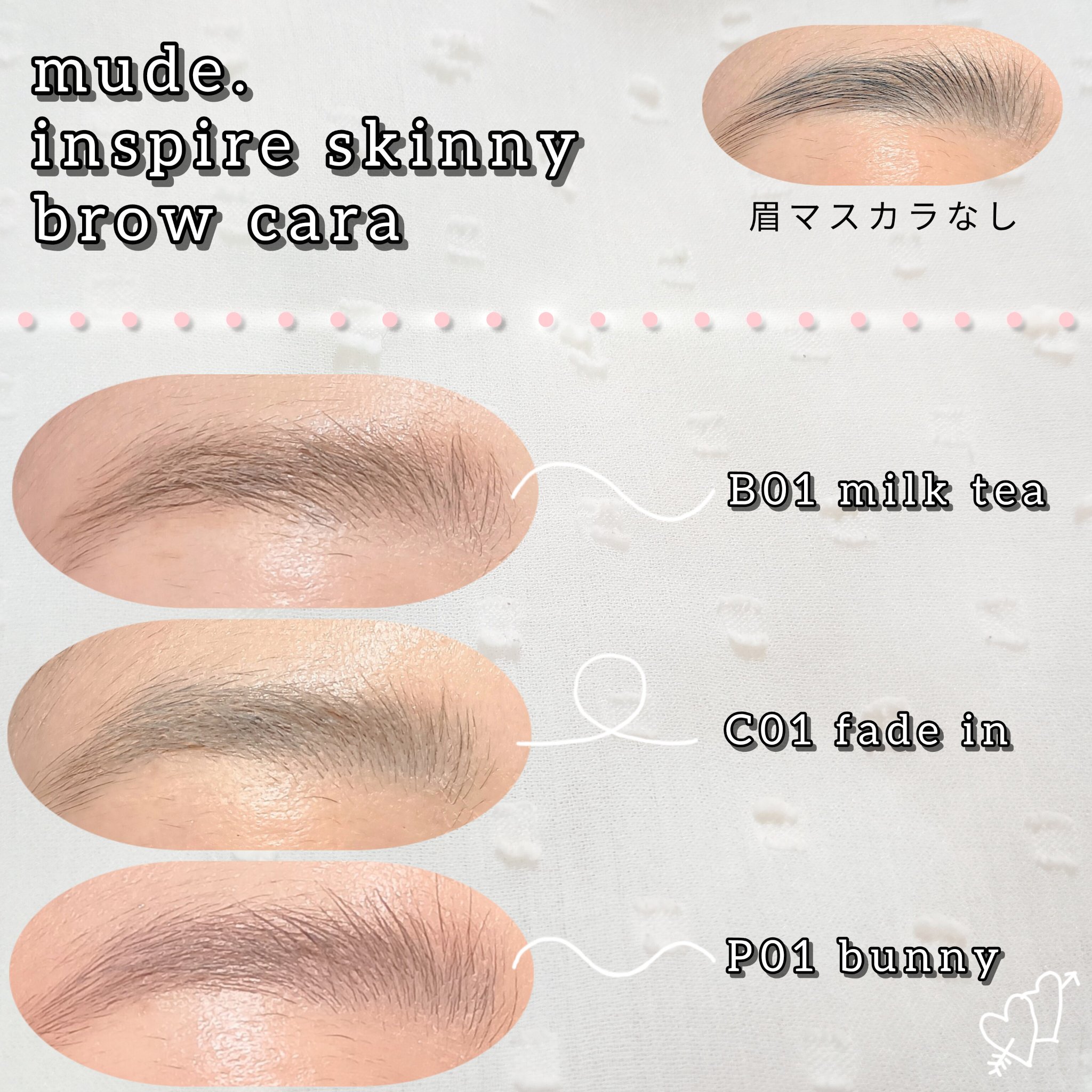 🧸▶︎▶︎▶︎𝐦𝐮𝐝𝐞.(@mude_official_jp)インスパイアスキニーブロウカラB01ミルクティーC01フェードインP01バニー♡...................♡1本1本を自然に整えてくれる、眉マスカラ✨小さめブラシだから...