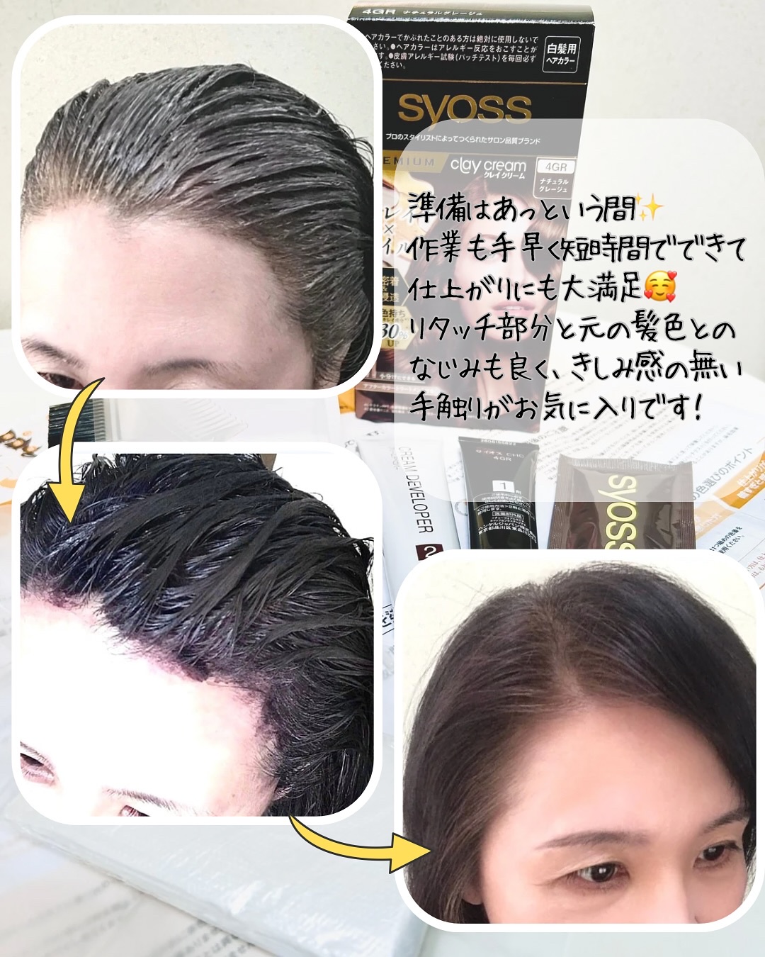 髪や頭皮に配慮しながら深い染まりと色持ちにこだわったクレイ配合のプレミアムな白髪染め⋈∗︎*゚syossサイオスクレイクリーム4Nナチュラルブラウンを使ってセルフ白髪染めしました𑁍܀100%天然クレイ配合の高密着クレイ処方で、生え際や短い毛ま...