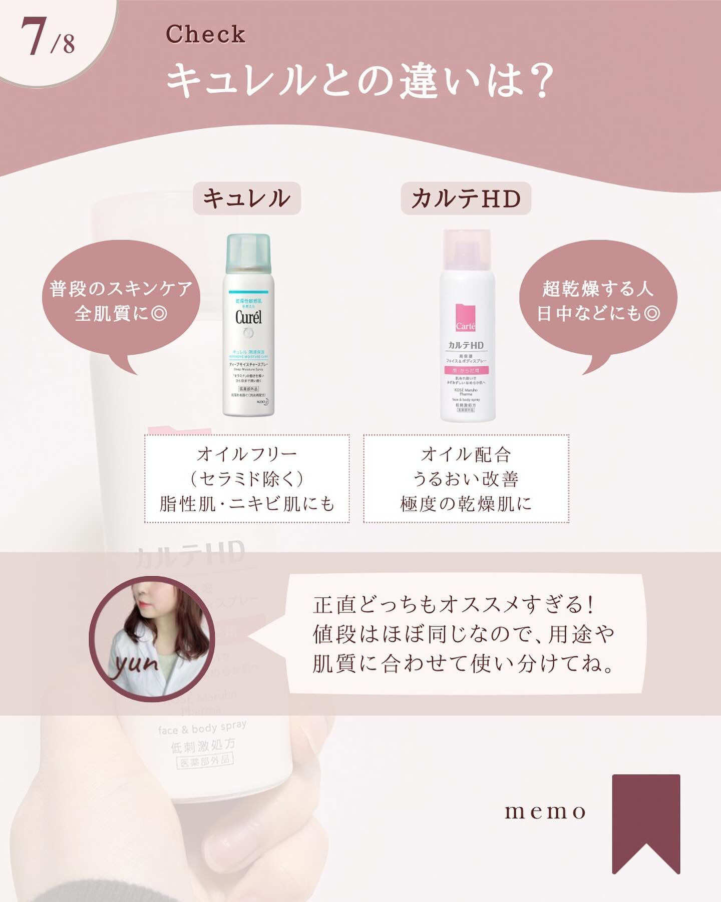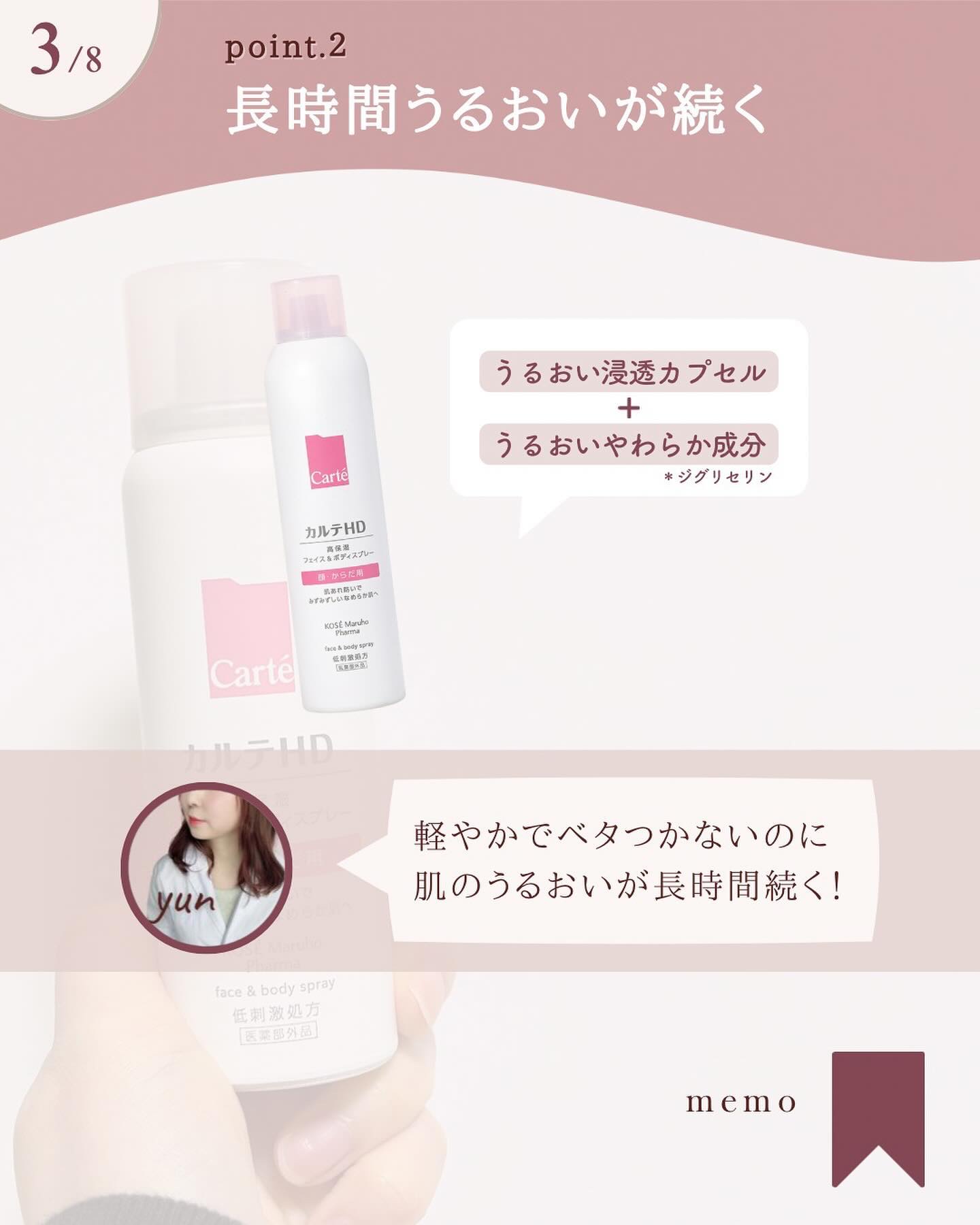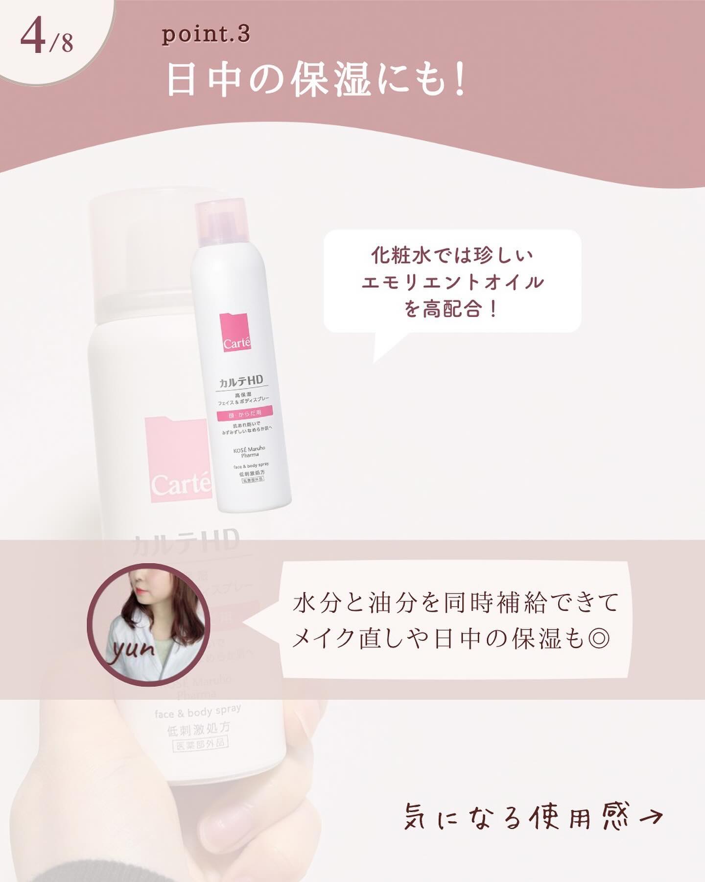 - 【全身用高保湿スプレー】 コーセーとマルホの合弁会社コーセーマルホファーマから発売された「カルテHD」。 エアゾールタイプの化粧水としては「初めて※1」ヘパリン類似物質HD※2を配合した全身用スプレー化粧水です。 配合のヘパリン類似物質HDはマルホから唯一供給を受けた「ヘパリン類似物質HD」を配合。 しっとり感とみずみずしさを叶える極上のミストが、すばやく広がり、全身をみずみずしいうるおいでふわっと包みます。 しっとりうるおうのにべたつかない軽やかな使い心地で、いつでもどこでも手軽な高保湿ケアを実現。 24時間乾燥の隙なし習慣を叶えます。 毎日のお顔のお手入れはもちろん、手の届きにくい背中などのボディケアや 子どもの全身保湿・男性のスキンケアなど幅広い場面で活躍。 うるおい構造(角層ラメラ)を整えて、あれにくい肌にみちびきます。 <販売名:HDフェイスボディSP> ※1 コーセーグループ商品として ※2 保水有効成分ヘパリン類似物質のこと