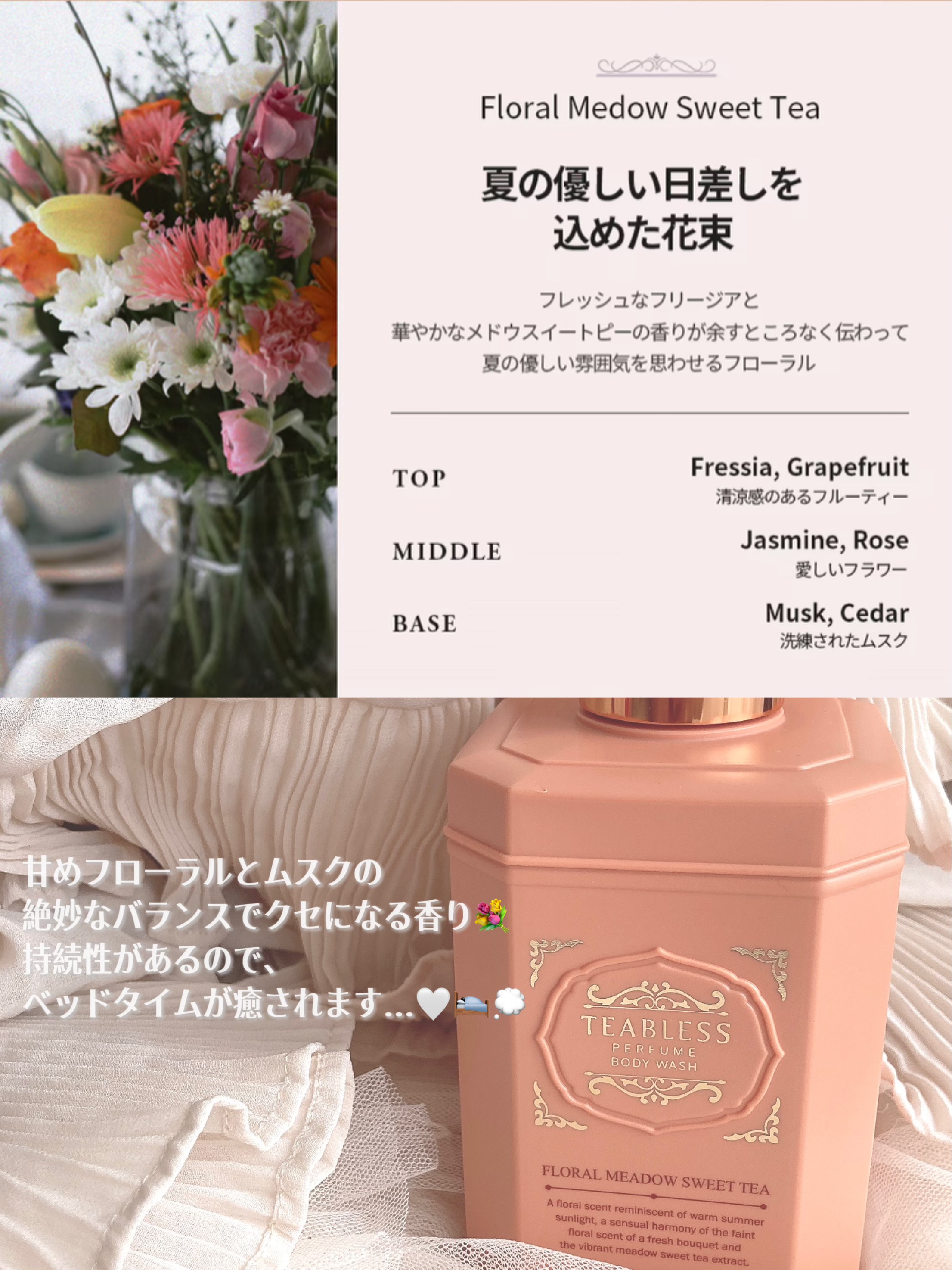 愛らしくて甘い香り🫖🎀【𝐓𝐄𝐀𝐁𝐋𝐄𝐒𝐒】♡𝐏𝐞𝐫𝐟𝐮𝐦𝐞𝐁𝐨𝐝𝐲𝐖𝐚𝐬𝐡𝐅𝐥𝐨𝐫𝐚𝐥𝐌𝐞𝐚𝐝𝐨𝐰𝐒𝐰𝐞𝐞𝐭𝐓𝐞𝐚♡.*・。。・*.♡お茶の有効成分と香りを盛り込んだティーパフュームパーソナルケア「ティーブレス」🫖✨フローラルメドウスイートテ...