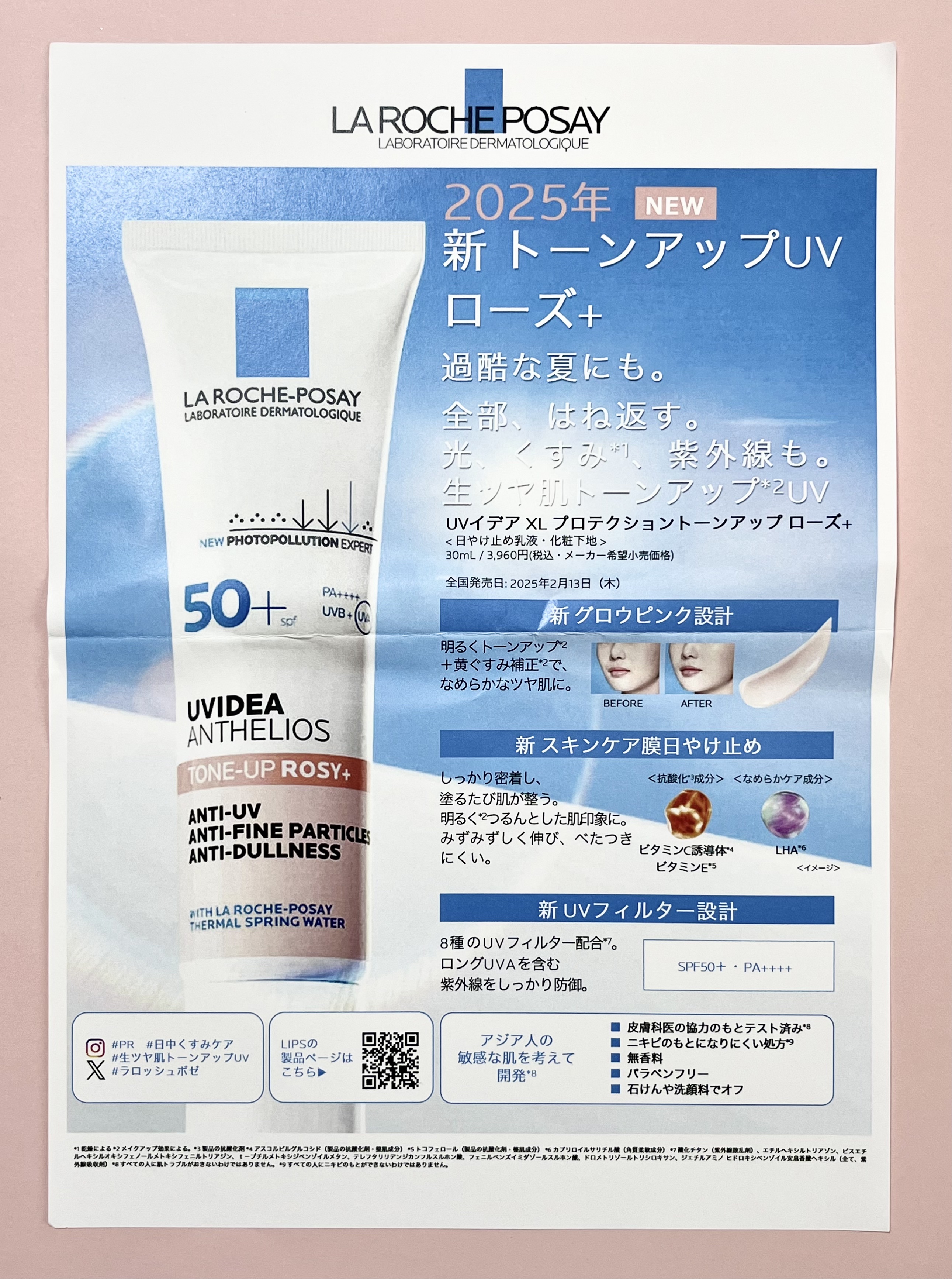 - 敏感肌用スキンケアUV No.1*が、 皮膚科学にも基づいてさらに進化。トーンアップUV ローズ+ 全部、はね返す 。 光、くすみ*1、紫外線も。 生ツヤ肌トーンアップ*2UV ●光の美しい反射に、新 グロウピンク設計 反射力アップ*2 + 黄ぐすみ補正*2 なめらかなツヤ肌*2に。 ●日中くすみ*1リスクに、新 スキンケア膜日焼け止め 整肌成分:ビタミンC誘導体*3 + ビタミンE *4 配合 なめらかケア成分:LHA *5 配合 塗るたび肌が整い、明るくつるんとした肌印象に。 ●紫外線対策に、新 UVフィルター設計*6 SPF50+・PA++++ 8種*6のフィルターで、ロングUVAを含む紫外線をしっかり防御。 ●皮膚科医の協力のもとテスト済み*7 ●ニキビのもとになりにくい処方*8 ●アジア人の敏感な肌でテスト済み*7 ●花粉など外的刺激から肌を守る ●石けん・洗顔料でオフ ●無香料 ●パラベンフリー *1 乾燥による *2 メイクアップ効果による。 *3 アスコルビルグルコシド(製品の抗酸化剤・整肌成分) *4 トコフェロール(製品の抗酸化剤・整肌成分) *5 カプリロイルサリチル酸(角質柔軟成分) *6 酸化チタン(紫外線散乱剤)、エチルヘキシルトリアゾン、ビスエチルヘキシルオキシフェノールメトキシフェニルトリアジン、t-ブチルメトキシジベンゾイルメタン、テレフタリリデンジカンフルスルホン酸、フェニルベンズイミダゾールスルホン酸、ドロメトリゾールトリシロキサン、ジエチルアミノヒドロキシベンゾイル安息香酸ヘキシル(全て、紫外線吸収剤) *7 すべての人に肌トラブルがおきないわけではありません。 *8 すべての人にニキビのもとができないわけではありません。