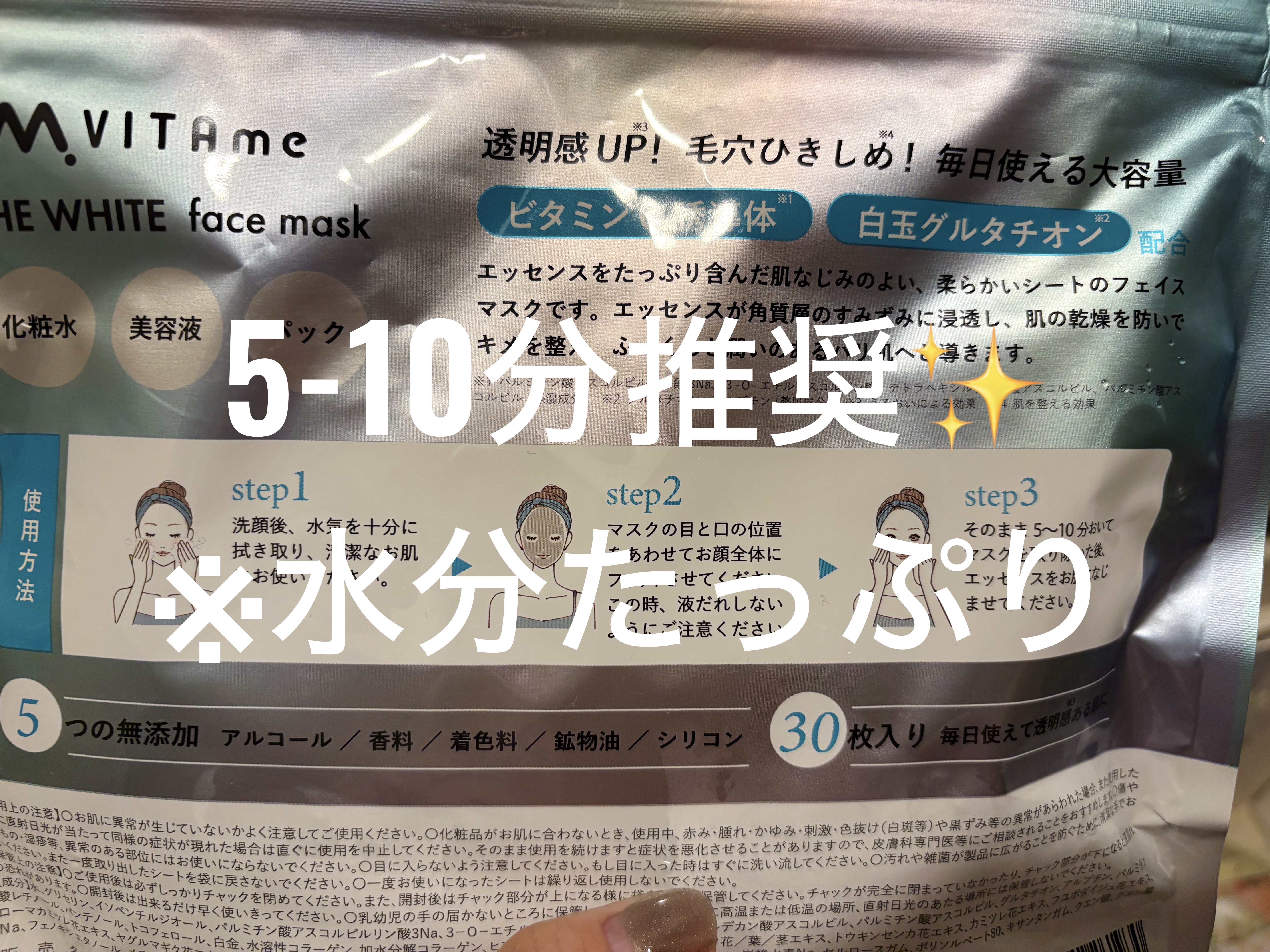 VITAmeのTHEWHITEfacemask買ってみた🎶AENAで600円もしなかったo(^_^)o💕お買い得‼️ビタミンC誘導体/白玉グルタチオン配合に惹かれて買ったんだけど成分見たら4種類のビタミンC誘導体入ってるし紫外線浴びたあとに良...