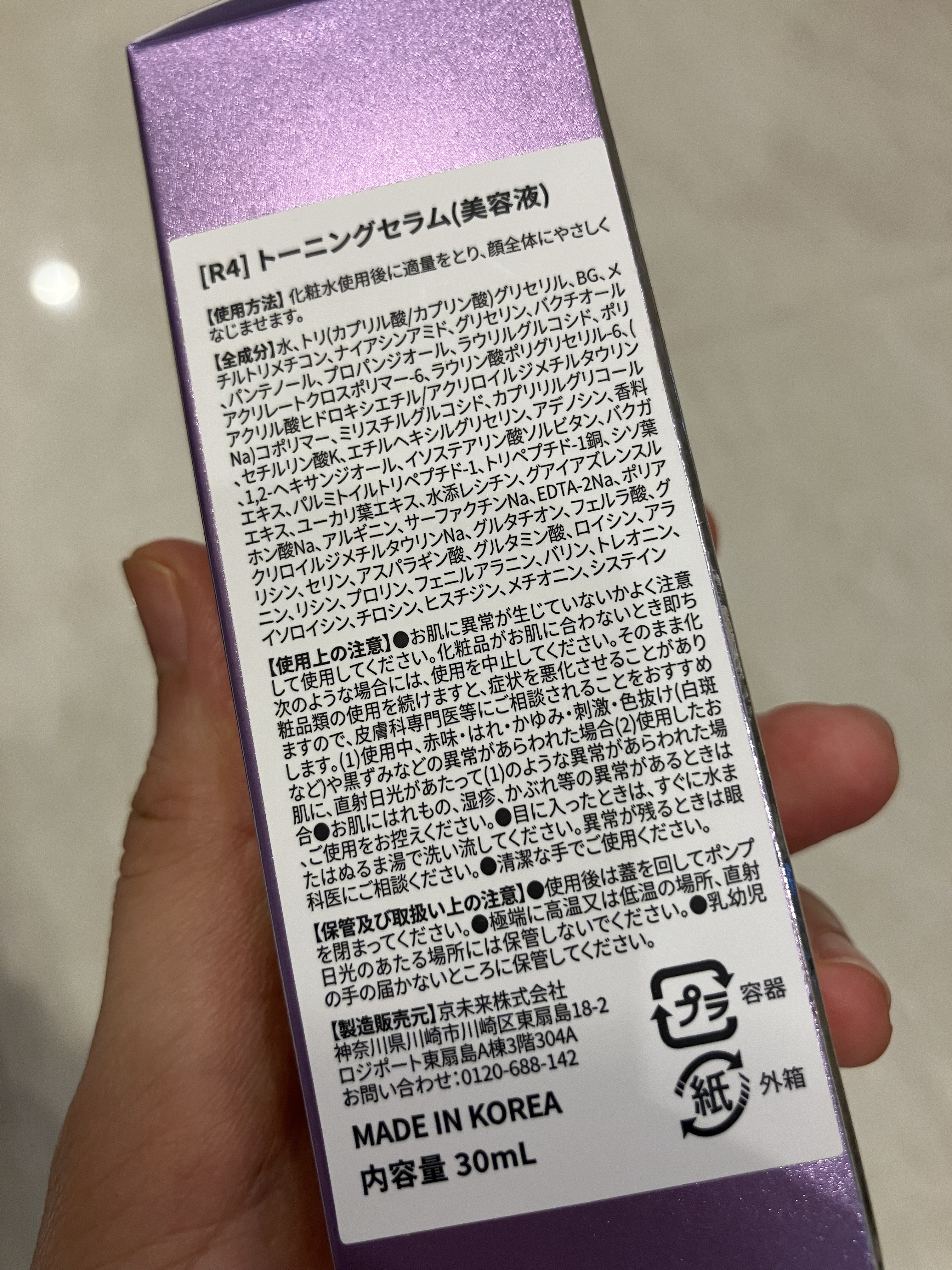 - <30ml> 精製水、トリ(カプリル/カプリン酸)グリセリル、BG、ナイアシンアミド、メチルトリメチコン、グリセリン、パンテノール、バクチオール、プロパンジオール、ラウリルグルコシド、ポリアクリレートクロスポリマー-6、ラウリン酸ポリグリセリル-10、アクリロイルジメチルタウリンNa)コポリマー、乳酸ミリスチル、カプリリルグリコール、セチルリン酸K、エチルヘキシルグリセリン、アデノシン、香料、1,2-ヘキサンジオール、イソステアリン酸ソルビタン、バクガエキス、トリペプチド-1銅、パルミトイルトリペプチド-1、シソ葉エキス、ユーカリ葉エキス、水添レシチン、グアイアズレンスルホン酸Na、アルギニン、サーファクチンNa、EDTA-2Na、ポリアクリロイルジメチルタウリンNa、フェルラ酸、グルタチオン、グリシン、セリン、アスパラギン酸、グルタミン酸、ロイシン、アラニン、リシン、プロリン、フェニルアラニン、トレオニン、バリン、イソロイシン、チロシン、ヒスチジン、メチオニン、システイン