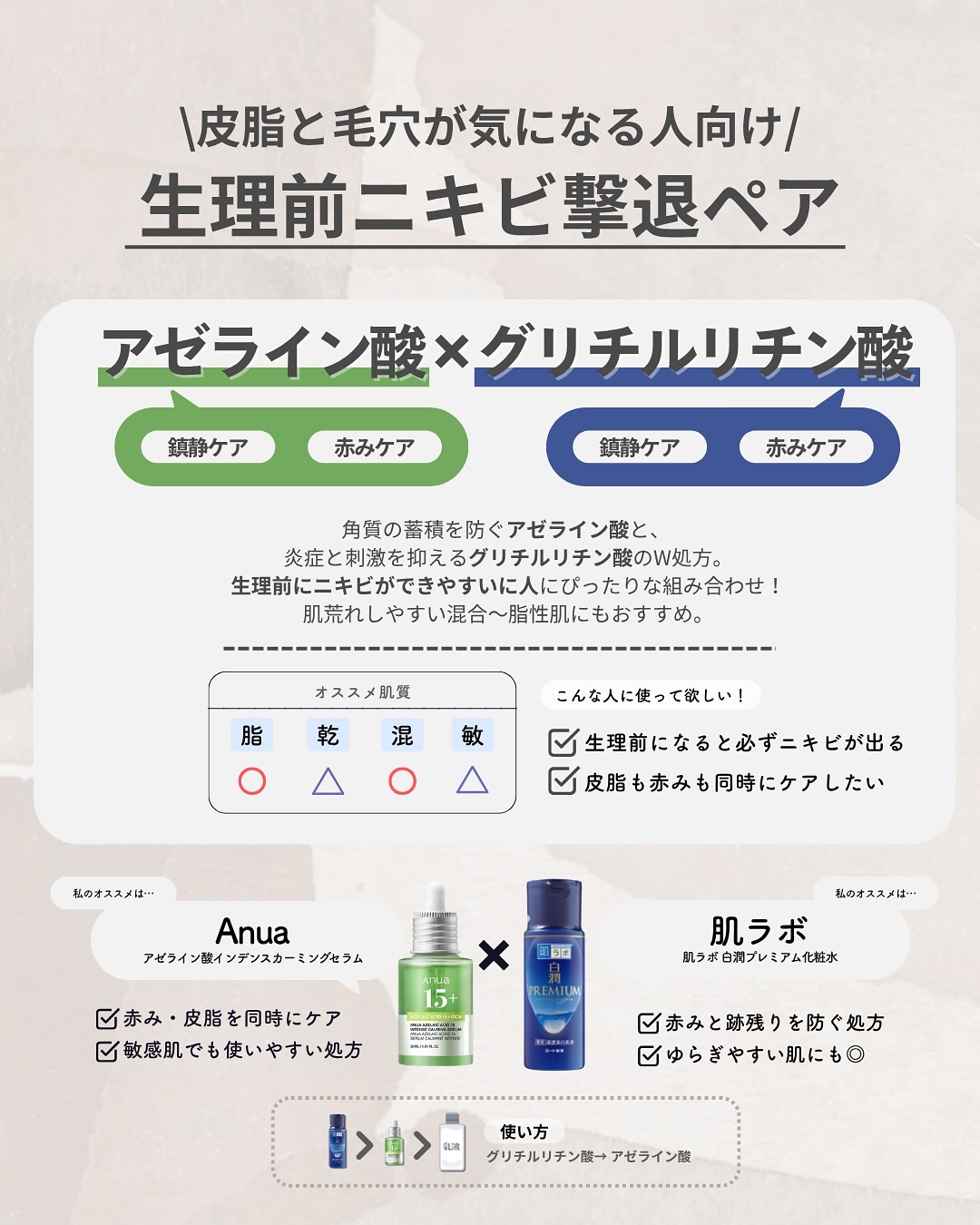 生理周期に合わせたスキンケア!フォロワーさんの中にも「繰り返すニキビがしぶとい」って何度も相談を受けていてやっとまとめられたよ~!!! 無敵のキラキラ期ピーリングなど新しいスキンケア試しちゃおう グリチルグリチン酸ジカリウムなどが配合されたスキンケアで肌荒れを防ぐお手入れ!