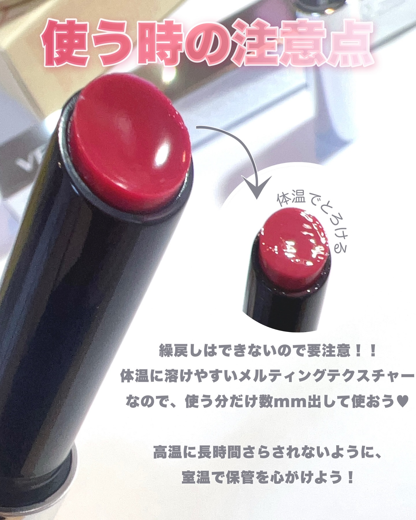| 口紅・グロス・リップライナーランキング第67位 | 溶けるとオイルっぽいテクスチャーなのですが しっとり感がある割にサラッとしていて ベタつかないので使いやすい! | 詳細を見る | ||