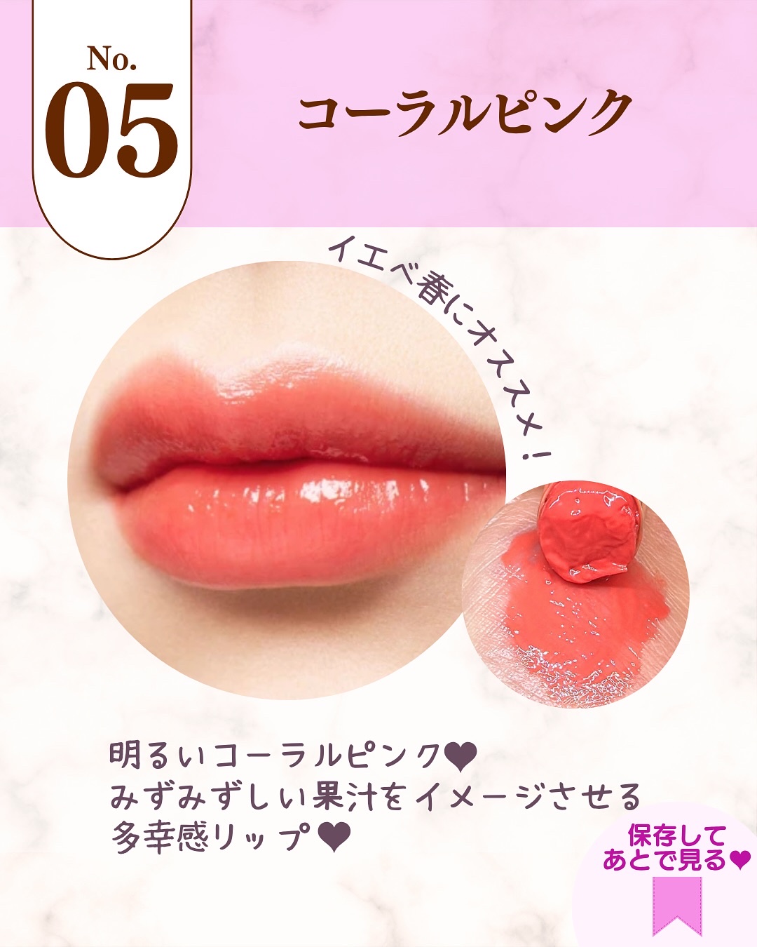 多幸感あふれるクリアなコーラル🩷 特に時間が経つと蛍光感がでてきちゃう。 THEピンクのリップを求めている人にピッタリ! ティッシュオフしても若干色は残ってる! おすすめの塗り方は、いつもよりも少し濃いめに塗ってから、ティッシュオフ!