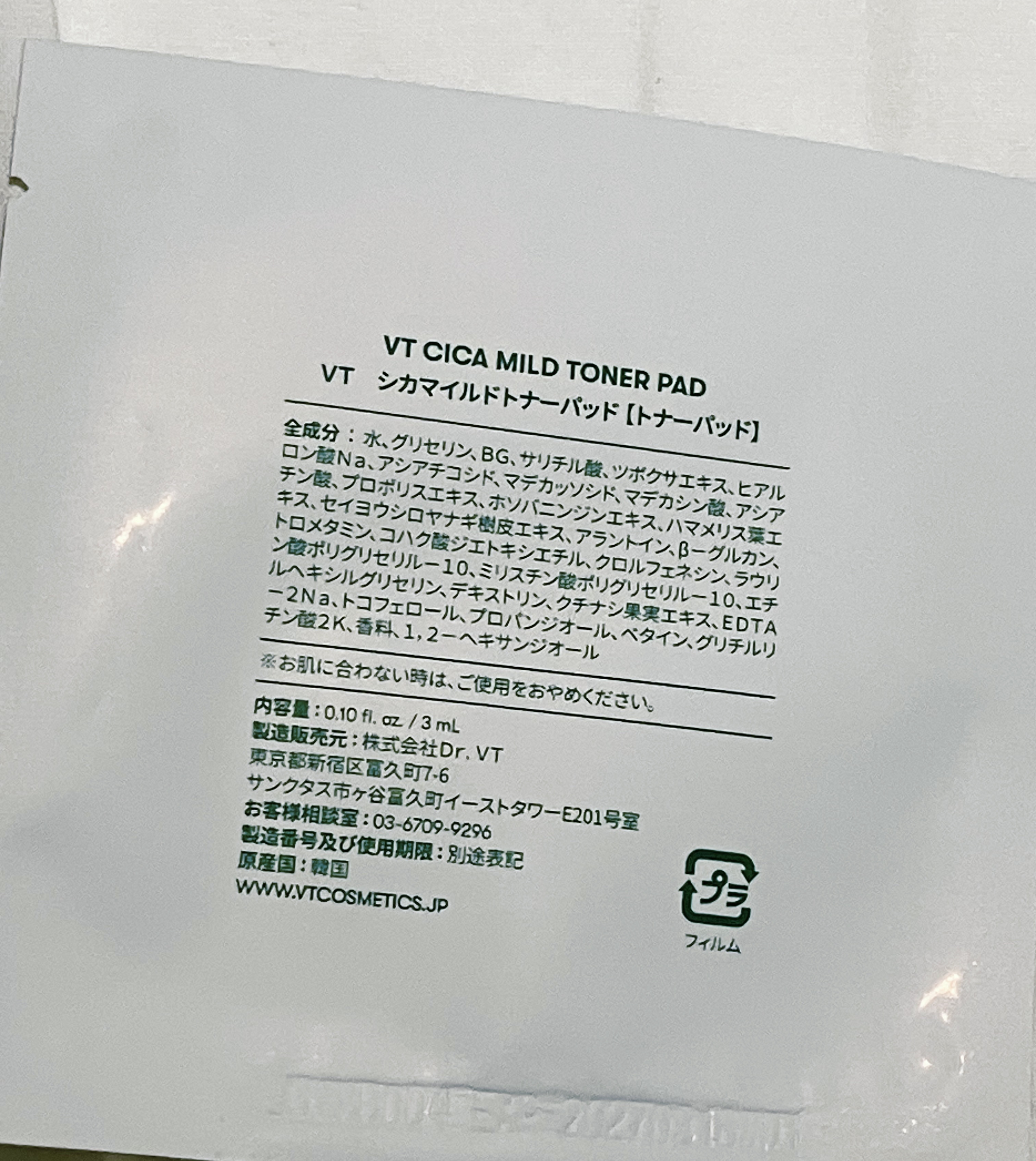 - <CICA マイルドトナーパッド> 水、グリセリン、BG、サリチル酸、ツボクサエキス、ヒアルロン酸Na、アシアチコシド、マデカッソシド、マデカシン酸、アシアチン酸、プロポリスエキス、ホソバニンジンエキス、ハマメリス葉エキス、セイヨウシロヤナギ樹皮エキス、アラントイン、β-グルカン、トロメタミン、コハク酸ジエトキシエチル、クロルフェネシン、ラウリン酸ポリグリセリル-10、ミリスチン酸ポリグリセリル-10、エチルヘキシルグリセリン、デキストリン、クチナシ果実エキス、EDTA-2Na、トコフェロール、プロパンジオール、ベタイン、グリチルリチン酸2K、香料、1,2 -ヘキサンジオール