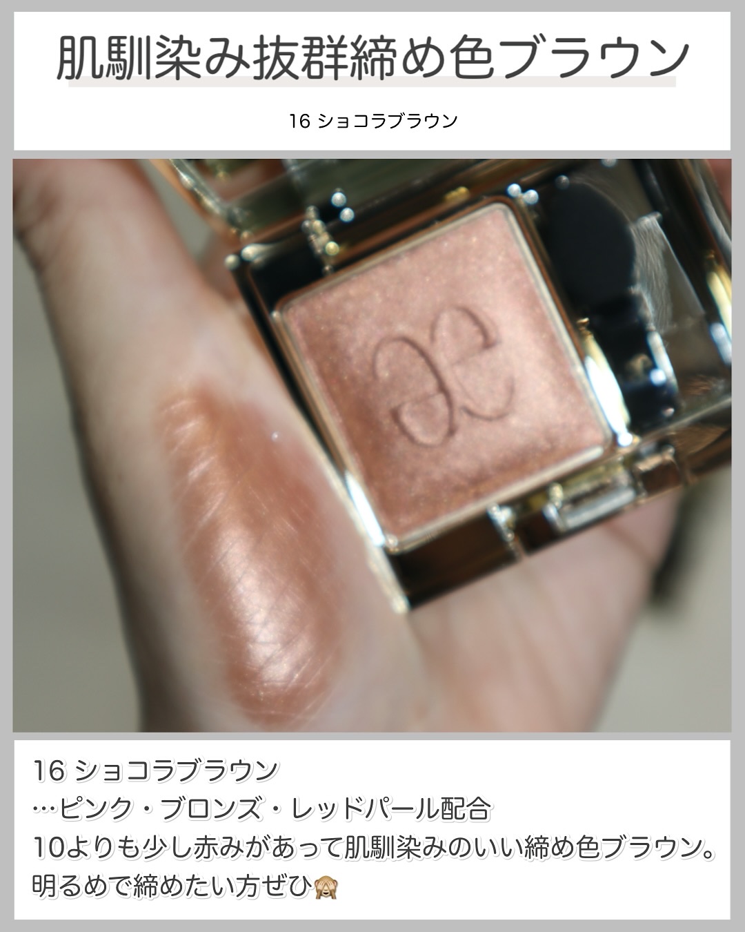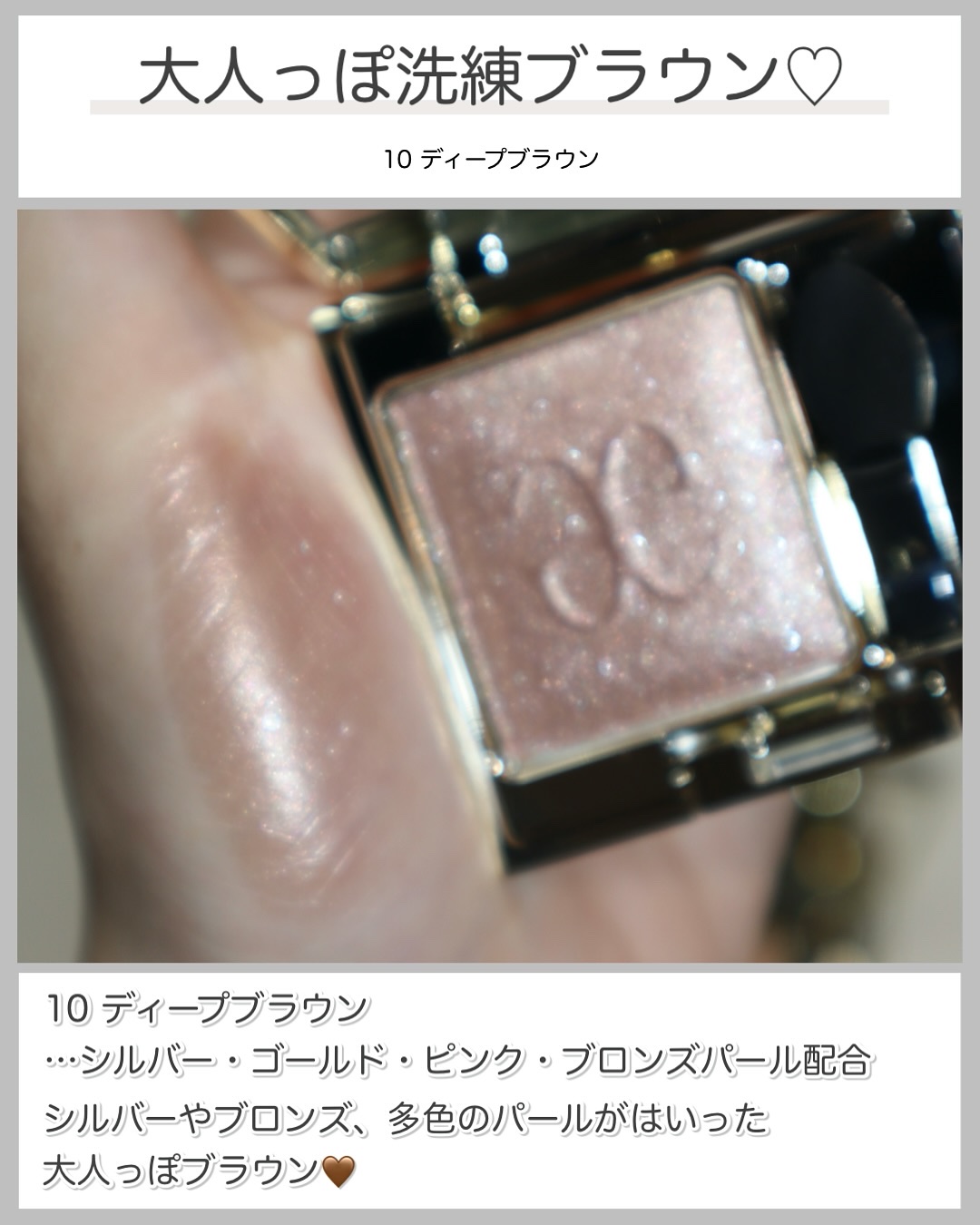 - 彩りと輝きがしっとり密着フィット。 瞳に存在感を宿す18色のシングルアイカラー 色と輝きで印象的な奥行きのある目もとへ ・1色ごとの存在感を高める発色・質感・輝きで、惹きつけるほどに美しい目もとに。 ・1色で美しいグラデーションと奥行きのある目もとを演出します。 クリアな発色となめらかな質感をひと塗りで ・透明度の高いベースが上質なツヤと繊細な発色を叶えます。 つけたままの美しさがヨレずにつづく ・透明度の高いパウダーと密着力に優れたオイルを含ませたウェットスムースベースを採用。まぶたに溶けこむようにムラなくフィットし、1色でも重ね付けをしてもにごりのないクリアな発色と、つけたての美しさが続きます。 チップのこだわり ・ミニマムで持ちやすい形状のシングルチップです。スムーズに取ることができ、まぶたの曲線や細かい部分にも使いやすい設計です。