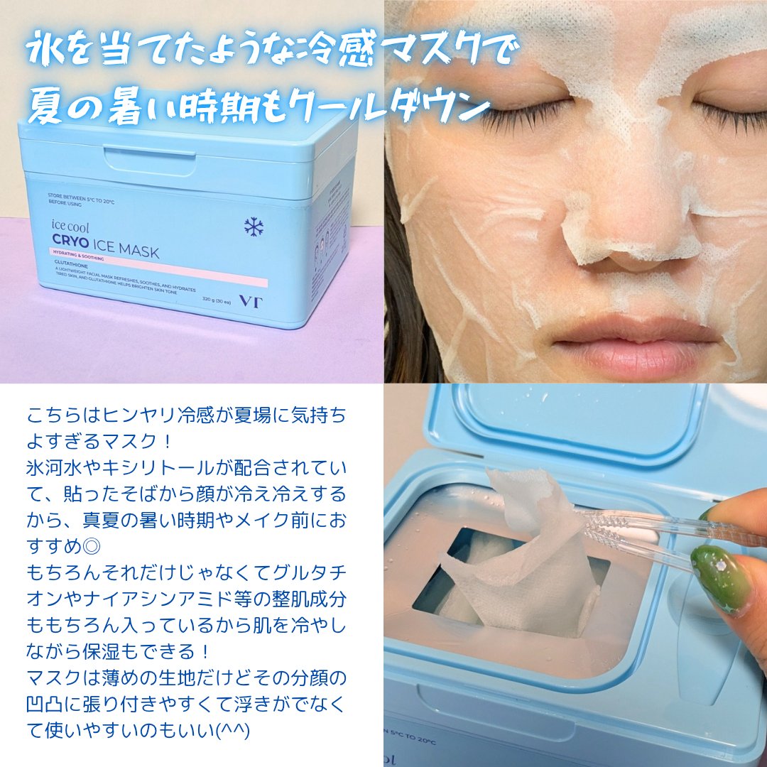 - べたつきが気になる暑い季節にぴったりな、ひんやり使用感あふれる30枚入り大容量マスクパックがVTから新登場! 氷河水*1やキシリトール1*配合で、肌にひんやり感を与えてリフレッシュ。 さらにグルタチオン*2・ナイアシンアミド*2配合で、夏の紫外線による乾燥ダメージケアにも! 肌にすばやくひんやり感を与える、夏にピッタリのマスク。 リピーター多数のVT人気「箱型マスク」シリーズから、この夏限定のクライオアイスマスクで“涼しさ感じるスキンケア”を始めましょう。 *1清涼成分 *2整肌成分 ■このような方へおすすめ 乾燥や紫外線などの外部刺激を受けた肌 紫外線、気温の高さにより乾燥した肌 夏シーズンの乾燥でくすんだ肌ケアが必要な方 暑い夏涼しくスキンケアをしたい方