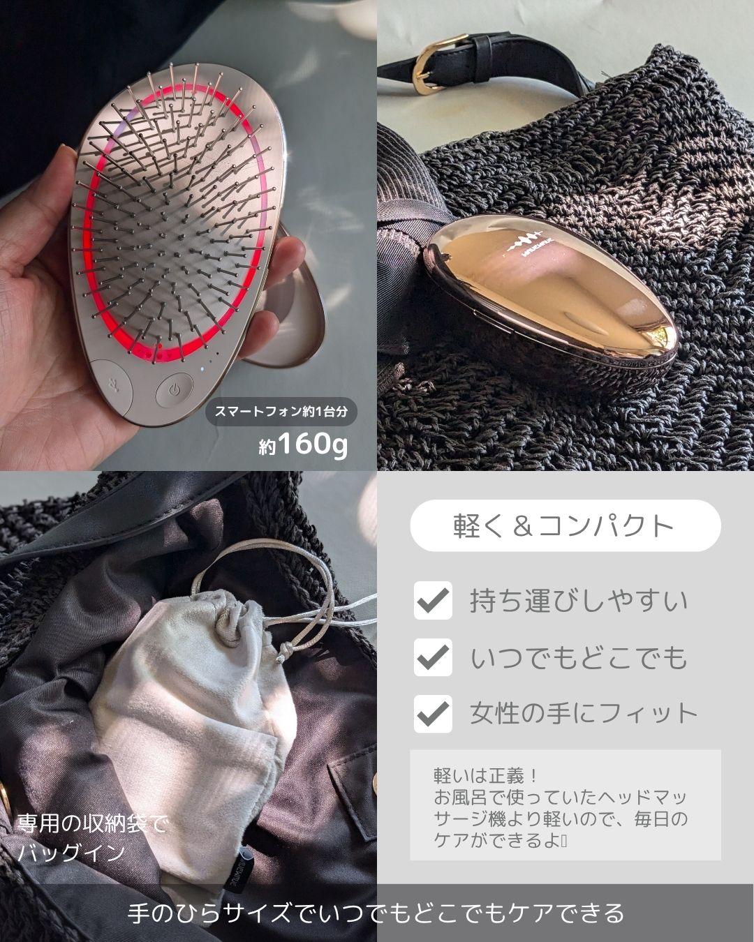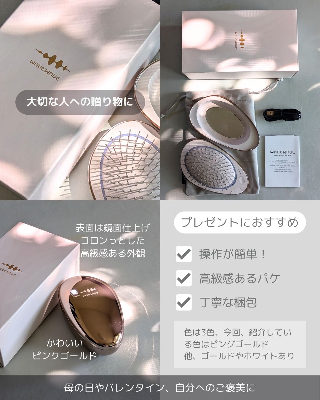 - 「EMS Brush Air mini」はピンクゴールド・ゴールド・ホワイトの3色展開。上品な光沢感とカラーリングが特徴で大切な方へのギフトや自分へのご褒美にもおすすめです。ケース内側に配されたミラーを使えばいつでもどこでも、気軽に本格ケアを堪能でき、旅行やご出張などが多い方にもおすすめのアイテムです。 [ 機能① 『EMS』で理想のフェイスラインへ ] 周波数の異なる2つの刺激を交互に送り出すことで、広域に均等に伝わる独自のEMSとマイクロカレント。やわらかなクッションと柔軟性のあるピンのおかげで、心地よい刺激が、広い範囲にやさしく、じんわりと伝わり、頭皮のリフトケアへと繋がります。 [ 機能② 『マイナスイオン』であこがれの艶髪へ ] 水分子に包まれたマイナスイオンが、髪表面を潤いでコーティング。保湿効果を高め、キューティクルを引き締めます。マイナスイオンが浸透すると、髪をなめらかにし、嫌な静電気も抑えます。 [ 機能③ 『赤色LED』で頭皮を元気に! ] 赤色LEDは頭皮への刺激が少なく、やさしいケアとして人気。すこやかな頭皮や髪を育てる環境づくりに役立ちます。頭皮のめぐりをよくすると共に、EMSと併せて使用することで、本格的なエステ効果が期待できます。 [ 機能④ 美容ケアの総合力を上げるバイブレーション ] 今回登場した「EMS Brush Air mini」は上記3つの機能をより深く、効果的に浸透させるための『バイブレーション機能』を追加しました。1分間5200回の細かな振動回数で、肌や筋肉をやさしくケアしながら、髪の絡まりもほぐしていきます。