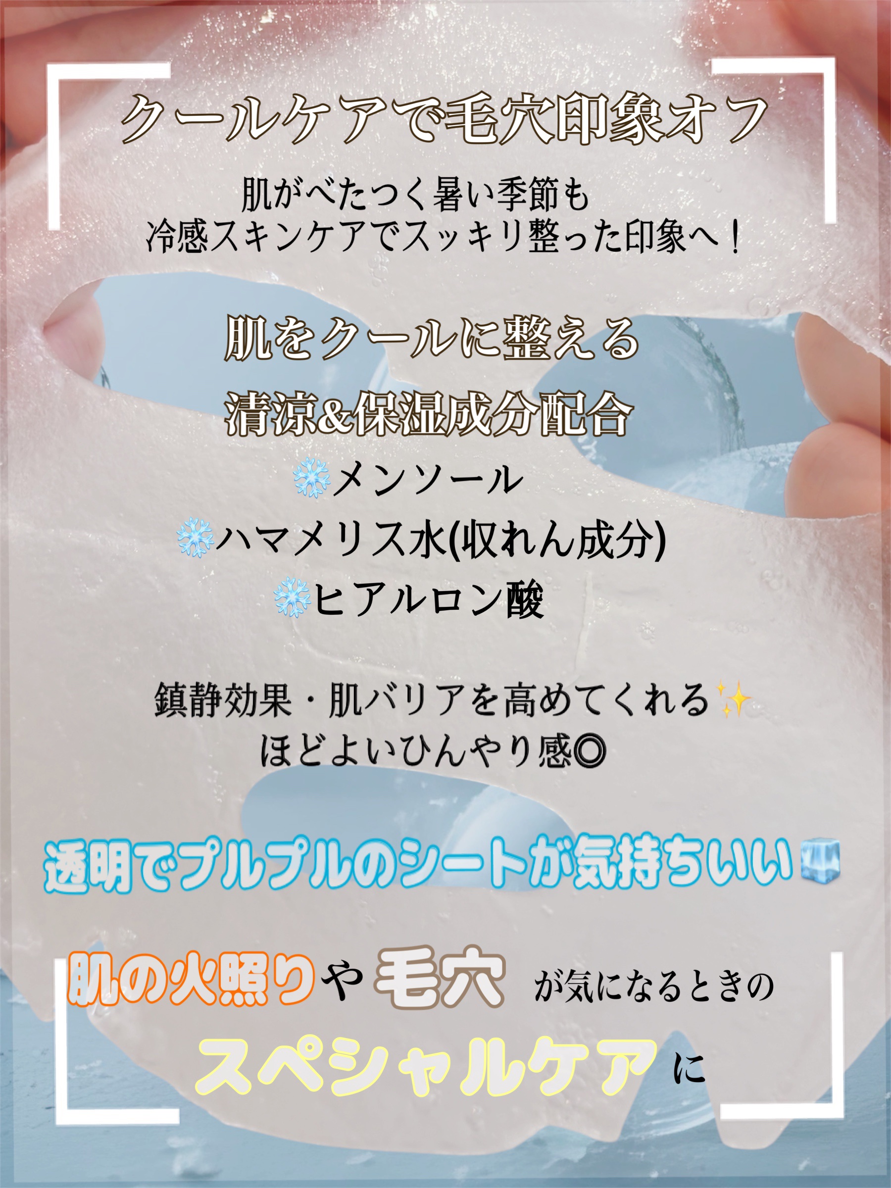- 肌のpHバランスをケアし、ひんやりとした使い心地で肌を整え、うるおいチャージをサポートするマスク。 強い日差しなど乾燥した肌を自然由来の保湿成分(アロエベラ葉エキス、アズレン)とメンソール清涼成分でひんやり整肌ケア。 エッセンスに触れるとふっくらと膨らみアロエ果実を詰め込んだようなしっとりセミジェルシートがひんやり感とクール感を与え、肌全体を隙間なく包み込みます。