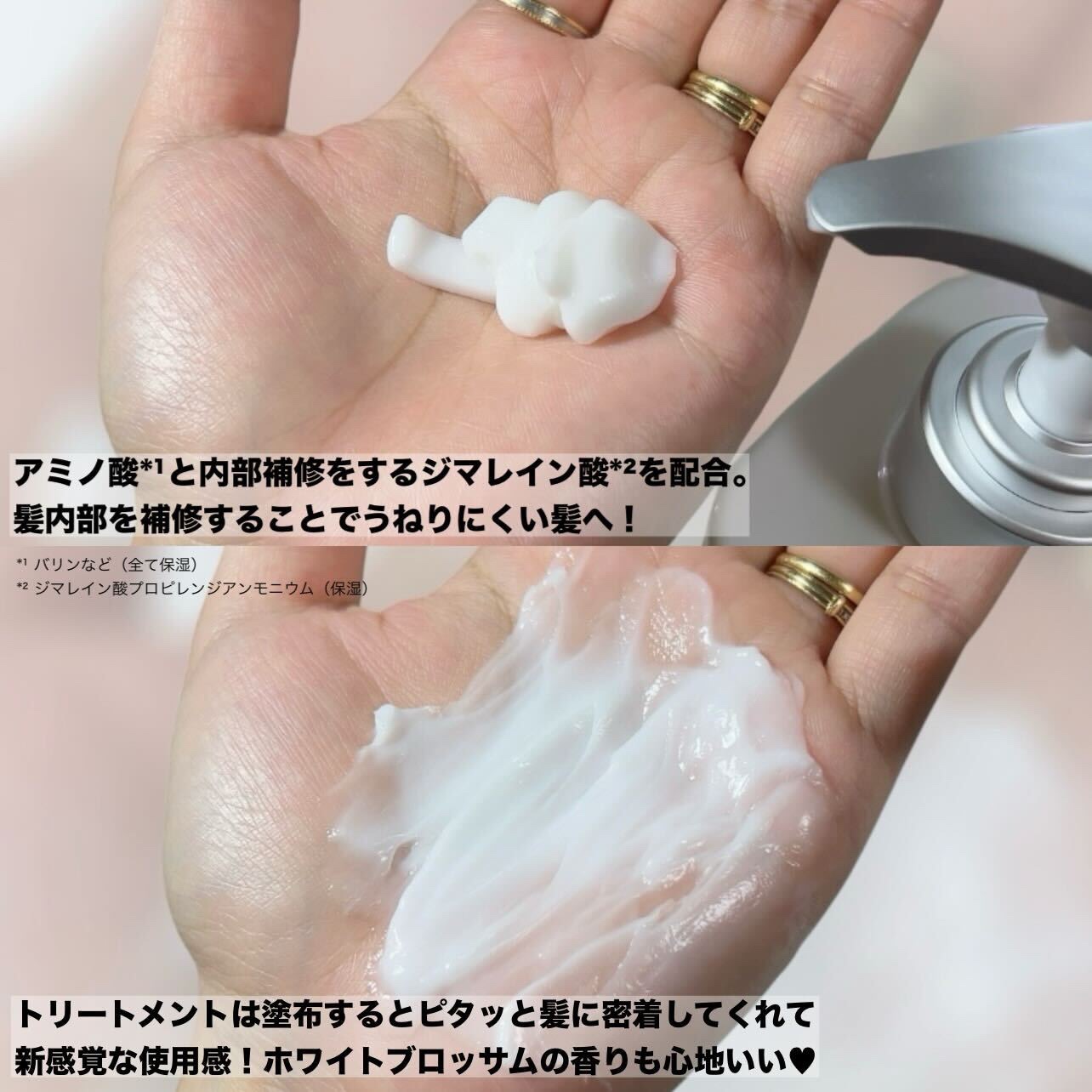 - <シャンプー> 水、コカミドプロピルベタイン、ラウラミドDEA、ラウリルグリコール酢酸Na、ココイル加水分解ケラチンK(羊毛)、ココイルメチルタウリンNa、ココイルグリシンNa、グリチルリチン酸2K、アラントイン、加水分解ケラチン(カシミヤヤギ)、加水分解ケラチン(羊毛)、加水分解シルク、ジマレイン酸プロピレンジアンモニウム、アミノエチルチオコハク酸ジアンモニウム、シスチン、グルタミン酸、アルギニン、リシンHCl、トレオニン、セリン、プロリン、ロイシン、バリン、アスパラギン酸、イソロイシン、グリシン、アラニン、フェニルアラニン、ヒスチジンHCl、メチオニン、トリプトファン、ヒドロキシプロピルトリモニウム加水分解ケラチン(羊毛)、(ジヒドロキシメチルシリルプロポキシ)ヒドロキシプロピル加水分解ケラチン(羊毛)、ココジモニウムヒドロキシプロピル加水分解ケラチン(羊毛)、イソステアロイル加水分解ケラチン(羊毛)、ケラチン、セラミドNP、セラミドNG、セラミドAP、セラミドEOP、セラミドAG、セテアラミドエチルジエトニウム加水分解コメタンパク、ラノリン脂肪酸、γ-ドコサラクトン、スイゼンジノリ多糖体、ヒスチジン、フィトステロールズ、PCA-Na、トリ(カプリル酸/カプリン酸)グリセリル、水添レシチン、グリセリン、BG、タウリン、ヤシ油脂肪酸PEG-7グリセリル、ポリクオタニウムー7、ポリクオタニウムー10、ヒドロキシプロピルシクロデキストリン、エチドロン酸、クエン酸、ブチルカルバミン酸ヨウ化プロピニル、エチドロン酸4Na、EDTA-4Na、イソノナン酸イソノニル、乳酸Na、ラウラミノプロピオン酸Na、PCA、塩化アンモニウム、香料、フェノキシエタノール <トリートメント> 水、セテアリルアルコール、アモジメチコン、ダイマージリノール酸水添ヒマシ油、BG、ベヘントリモニウムクロリド、加水分解シルク、加水分解ケラチン(カシミヤヤギ)、アミノエチルチオコハク酸ジアンモニウム、γ-ドコサラクトン、セテアラミドエチルジエトニウム加水分解コメタンパク、ラノリン脂肪酸、ジグルコシル没食子酸、ジマレイン酸プロピレンジアンモニウム、シスチン、グルタミン酸、アルギニン、リシンHCl、トレオニン、セラミドNG、セラミドAP、セラミドAG、セラミドNP、セラミドEOP、スイゼンジノリ多糖体、セリン、プロリン、ロイシン、バリン、アスパラギン酸、イソロイシン、グリシン、アラニン、フェニルアラニン、ヒスチジンHCl、メチオニン、トリプトファン、グリチルリチン酸2K、アラントイン、ヒドロキシプロピルトリモニウム加水分解ケラチン(羊毛)、(ジヒドロキシメチルシリルプロポキシ)ヒドロキシプロピル加水分解ケラチン(羊毛)、ココジモニウムヒドロキシプロピル加水分解ケラチン(羊毛)、イソステアロイル加水分解ケラチン(羊毛)、加水分解ケラチン(羊毛)、ケラチン、ヒスチジン、フィトステロールズ、PCA-Na、乳酸Na、ラウラミノプロピオン酸Na、PCA、クエン酸、ヒドロキシプロピルデンプンリン酸、イソプロパノール、トリ(カプリル酸/カプリン酸)グリセリル、グリセリン、イソノナン酸イソノニル、水添レシチン、タウリン、セトリモニウムクロリド、塩化アンモニウム、香料、フェノキシエタノール <シャンプー(詰め替え) 400mL> 水、コカミドプロピルベタイン、ラウラミドDEA、ラウリルグリコール酢酸Na、ココイル加水分解ケラチンK(羊毛)、ココイルメチルタウリンNa、ココイルグリシンNa、グリチルリチン酸2K、アラントイン、加水分解ケラチン(カシミヤヤギ)、加水分解ケラチン(羊毛)、加水分解シルク、ジマレイン酸プロピレンジアンモニウム、アミノエチルチオコハク酸ジアンモニウム、シスチン、グルタミン酸、アルギニン、リシンHCl、トレオニン、セリン、プロリン、ロイシン、バリン、アスパラギン酸、イソロイシン、グリシン、アラニン、フェニルアラニン、ヒスチジンHCl、メチオニン、トリプトファン、ヒドロキシプロピルトリモニウム加水分解ケラチン(羊毛)、(ジヒドロキシメチルシリルプロポキシ)ヒドロキシプロピル加水分解ケラチン(羊毛)、ココジモニウムヒドロキシプロピル加水分解ケラチン(羊毛)、イソステアロイル加水分解ケラチン(羊毛)、ケラチン、セラミドNP、セラミドNG、セラミドAP、セラミドEOP、セラミドAG、セテアラミドエチルジエトニウム加水分解コメタンパク、ラノリン脂肪酸、γ-ドコサラクトン、スイゼンジノリ多糖体、ヒスチジン、フィトステロールズ、PCA-Na、トリ(カプリル酸/カプリン酸)グリセリル、水添レシチン、グリセリン、BG、タウリン、ヤシ油脂肪酸PEG-7グリセリル、ポリクオタニウムー7、ポリクオタニウムー10、ヒドロキシプロピルシクロデキストリン、エチドロン酸、クエン酸、ブチルカルバミン酸ヨウ化プロピニル、エチドロン酸4Na、EDTA-4Na、イソノナン酸イソノニル、乳酸Na、ラウラミノプロピオン酸Na、PCA、塩化アンモニウム、香料、フェノキシエタノール <シャンプー 大容量詰め替え(1,000mL)> 水、コ