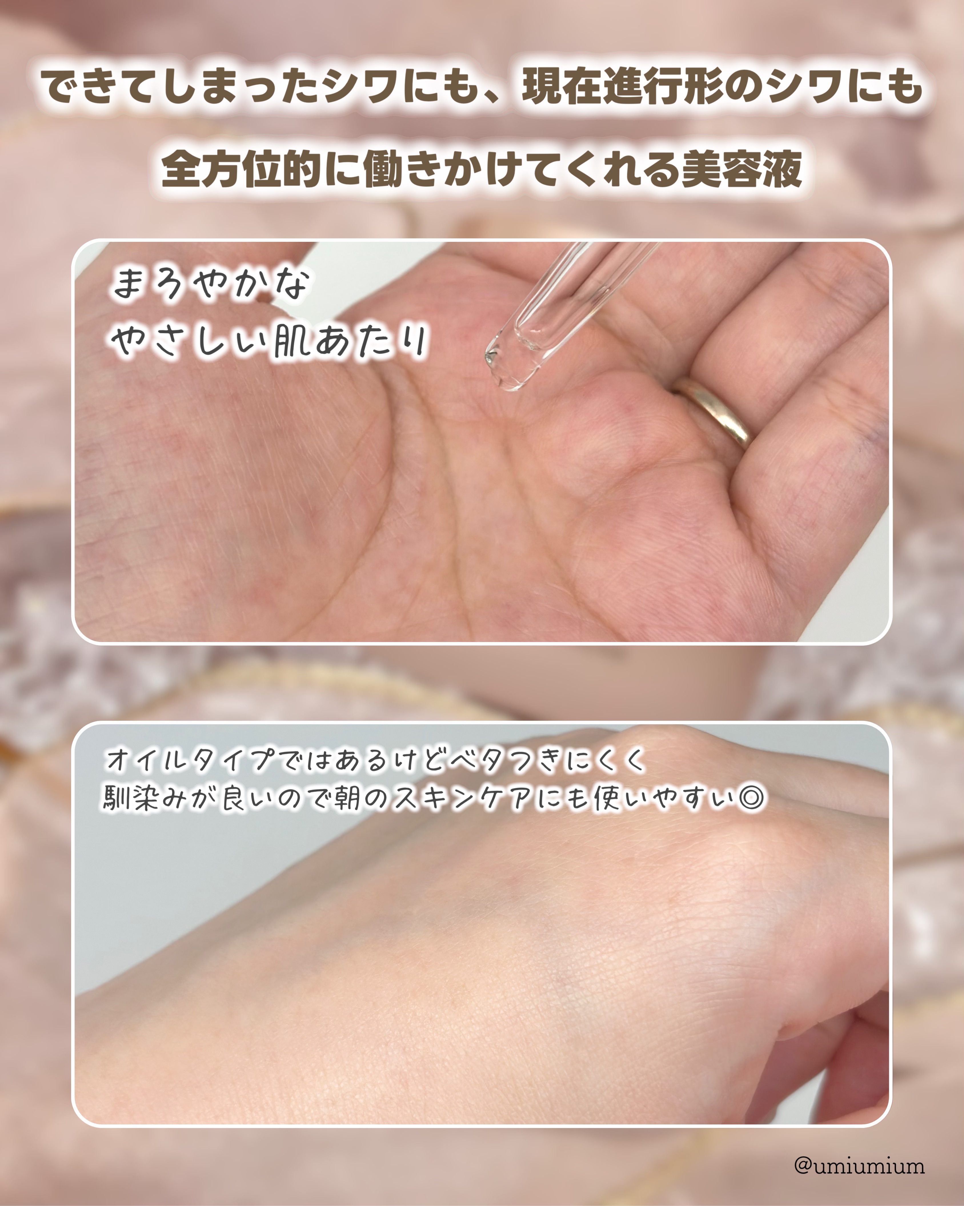 | スポイトタイプで使いやすいのも嬉しい。 サラッとしたなめらかなテクスチャーで肌に広げやすいよ。 | 詳細を見る | |