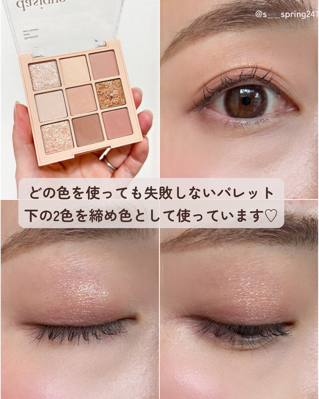 このアイシャドウはとにかく粉がしっとり! 細かい粉質が魅力的です! これを使うとなぜが目が大きく見える気がします😳! ピンクとオレンジ系の組み合わせなので ピンク系が欲しいけれど、 甘すぎないアイシャドウが欲しい方におすすめです!