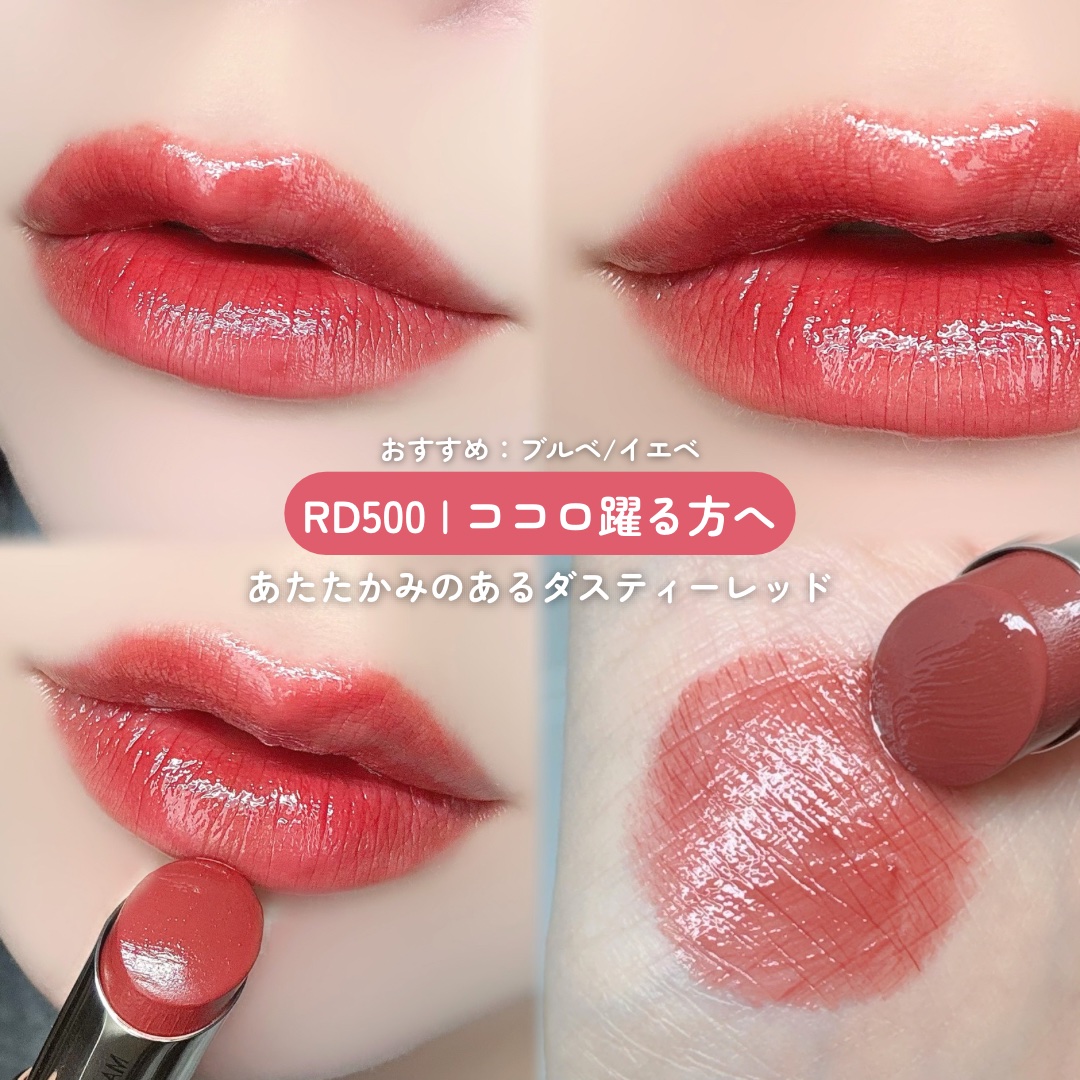 絶妙なツヤ感と発色のリップだったよ🫦 ジェル膜処方のリップだからカラーの持ちも良くって、ご飯食べても残ってたのもポイント高い❤︎ 唇に乗せると自分の色と相まってレッドブラウン系に発色する! もっとみたまま発色にしたいならコンシーラー使うと良いらしい🙆 気になった方、ぜひチェックしてみて𓂃𓈒𓏸