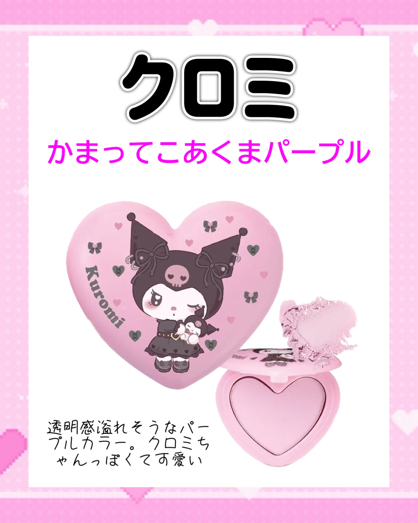 - “マルチカラーパウダー“は、アイカラーやチーク、ハイライトにご使用いただけます。 ぷっくり可愛いハート型容器の天面には、「うるうるハートデザイン」の株式会社サンリオの「サンリオキャラクターズ」をデザインし、キャラクターの世界観に合わせたカラーのパウダーを組み合わせました。