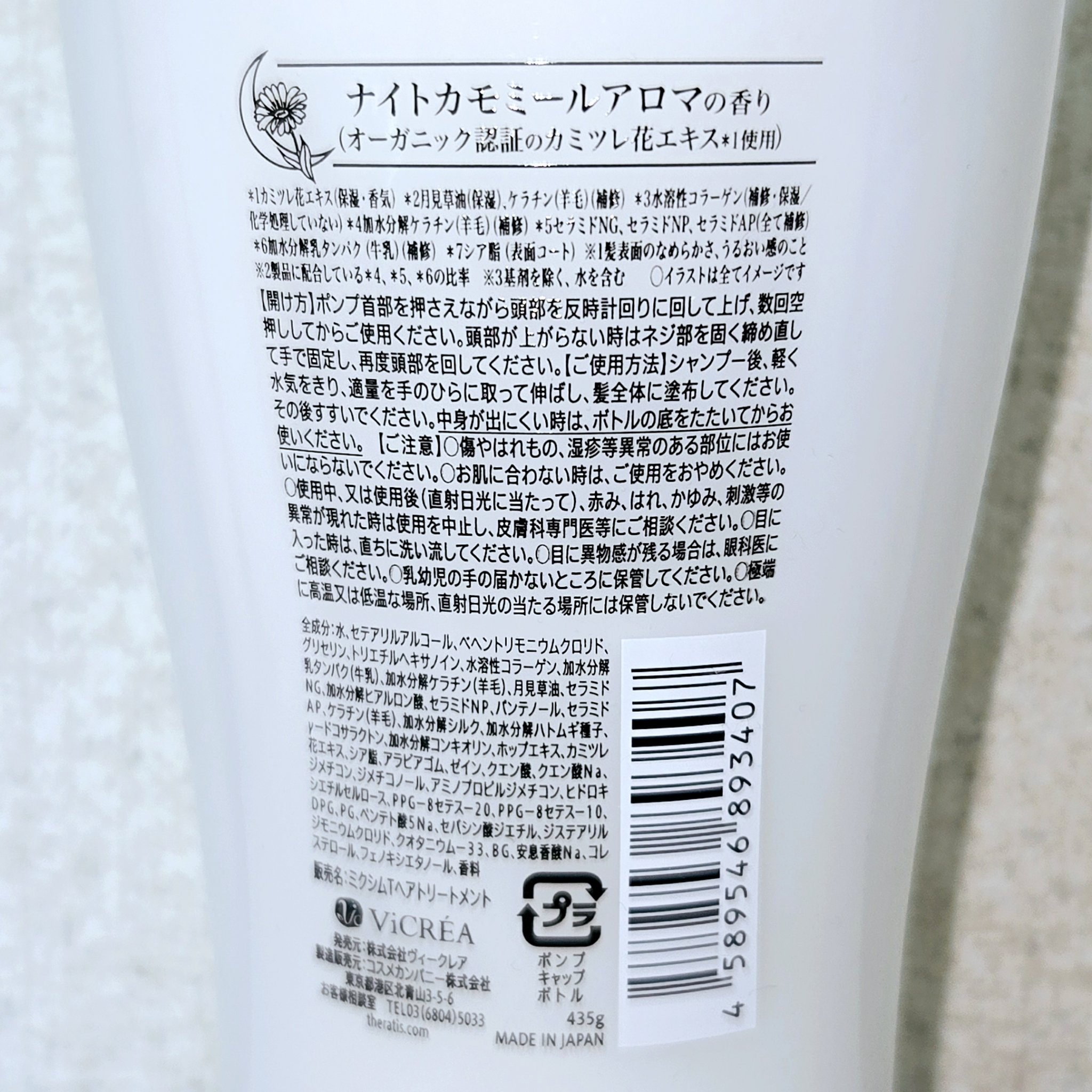 - <シャンプー本体435ml> 水、セテアリルアルコール、ベヘントリモニウムクロリド、グリセリン、トリエチルヘキサノイン、水溶性コラーゲン、加水分解乳タンパク、加水分解ケラチン(羊毛)、月見草油、セラミドNG、加水分解ヒアルロン酸、セラミドNP、パンテノール、セラミドAP、ケラチン(羊毛)、加水分解シルク、加水分解ハトムギ種子、γ−ドコサラクトン、加水分解コンキオリン、ホップエキス、カミツレ花エキス、シア脂、アラビアゴム、ゼイン、クエン酸、クエン酸Na、ジメチコン、ジメチコノール、アミノプロピルジメチコン、ヒドロキシエチルセルロース、PPG−8セテス−20、PPG−8セテス−10、DPG、PG、ペンテト酸5Na、セバシン酸ジエチル、ジステアリルジモニウムクロリド、クオタニウム−33、BG、安息香酸Na、コレステロール、フェノキシエタノール、香料 <シャンプー詰替325ml> 水、セテアリルアルコール、ベヘントリモニウムクロリド、グリセリン、トリエチルヘキサノイン、水溶性コラーゲン、加水分解乳タンパク、加水分解ケラチン(羊毛)、月見草油、セラミドNG、加水分解ヒアルロン酸、セラミドNP、パンテノール、セラミドAP、ケラチン(羊毛)、加水分解シルク、加水分解ハトムギ種子、γ−ドコサラクトン、加水分解コンキオリン、ホップエキス、カミツレ花エキス、シア脂、アラビアゴム、ゼイン、クエン酸、クエン酸Na、ジメチコン、ジメチコノール、アミノプロピルジメチコン、ヒドロキシエチルセルロース、PPG−8セテス−20、PPG−8セテス−10、DPG、PG、ペンテト酸5Na、セバシン酸ジエチル、ジステアリルジモニウムクロリド、クオタニウム−33、BG、安息香酸Na、コレステロール、フェノキシエタノール、香料 <トリートメント本体435g> 水、セテアリルアルコール、ベヘントリモニウムクロリド、グリセリン、トリエチルヘキサノイン、水溶性コラーゲン、加水分解乳タンパク、加水分解ケラチン(羊毛)、月見草油、セラミドNG、加水分解ヒアルロン酸、セラミドNP、パンテノール、セラミドAP、ケラチン(羊毛)、加水分解シルク、加水分解ハトムギ種子、γ-ドコサラクトン、加水分解コンキオリン、ホップエキス、カミツレ花エキス、シア脂、アラビアゴム、ゼイン、クエン酸、クエン酸Na、ジメチコン、ジメチコノール、アミノプロピルジメチコン、ヒドロキシエチルセルロース、PPG-8セテス-20、PPG-8セテス-10、DPG、PG、ペンテト酸5Na、セバシン酸ジエチル、ジステアリルジモニウムクロリド、クオタニウム-33、BG、安息香酸Na、コレステロール、フェノキシエタノール、香料 <トリートメント詰替325g> 水、セテアリルアルコール、ベヘントリモニウムクロリド、グリセリン、トリエチルヘキサノイン、水溶性コラーゲン、加水分解乳タンパク、加水分解ケラチン(羊毛)、月見草油、セラミドNG、加水分解ヒアルロン酸、セラミドNP、パンテノール、セラミドAP、ケラチン(羊毛)、加水分解シルク、加水分解ハトムギ種子、γ-ドコサラクトン、加水分解コンキオリン、ホップエキス、カミツレ花エキス、シア脂、アラビアゴム、ゼイン、クエン酸、クエン酸Na、ジメチコン、ジメチコノール、アミノプロピルジメチコン、ヒドロキシエチルセルロース、PPG-8セテス-20、PPG-8セテス-10、DPG、PG、ペンテト酸5Na、セバシン酸ジエチル、ジステアリルジモニウムクロリド、クオタニウム-33、BG、安息香酸Na、コレステロール、フェノキシエタノール、香料 <トリートメント 詰め替え 813g> 水、セテアリルアルコール、ベヘントリモニウムクロリド、グリセリン、トリエチルヘキサノイン、水溶性コラーゲン、加水分解乳タンパク、加水分解ケラチン(羊毛)、月見草油、セラミドNG、加水分解ヒアルロン酸、セラミドNP、パンテノール、セラミドAP、ケラチン(羊毛)、加水分解シルク、加水分解ハトムギ種子、γ-ドコサラクトン、加水分解コンキオリン、ホップエキス、カミツレ花エキス、シア脂、アラビアゴム、ゼイン、クエン酸、クエン酸Na、ジメチコン、ジメチコノール、アミノプロピルジメチコン、ヒドロキシエチルセルロース、PPG-8セテス-20、PPG-8セテス-10、DPG、PG、ペンテト酸5Na、セバシン酸ジエチル、ジステアリルジモニウムクロリド、クオタニウム-33、BG、安息香酸Na、コレステロール、フェノキシエタノール、香料 <シャンプー詰替え(増量) 358ml> 水、セテアリルアルコール、ベヘントリモニウムクロリド、グリセリン、トリエチルヘキサノイン、水溶性コラーゲン、加水分解乳タンパク、加水分解ケラチン(羊毛)、月見草油、セラミドNG、加水分解ヒアルロン酸、セラミドNP、パンテノール、セラミドAP、ケラチン(羊毛)、加水分解シルク、加水分解ハトムギ種子、γ−ドコサラクトン、加水分解コンキオリン、ホップエキス、カミツレ花エキス、シア脂、アラビアゴム、ゼイン、クエン酸、クエン酸Na、ジメチコン、ジメチコノール、アミノプロピルジメチコン、ヒドロキシエチルセルロース、PPG−8セテス−20、PPG−8セテス−10、DPG