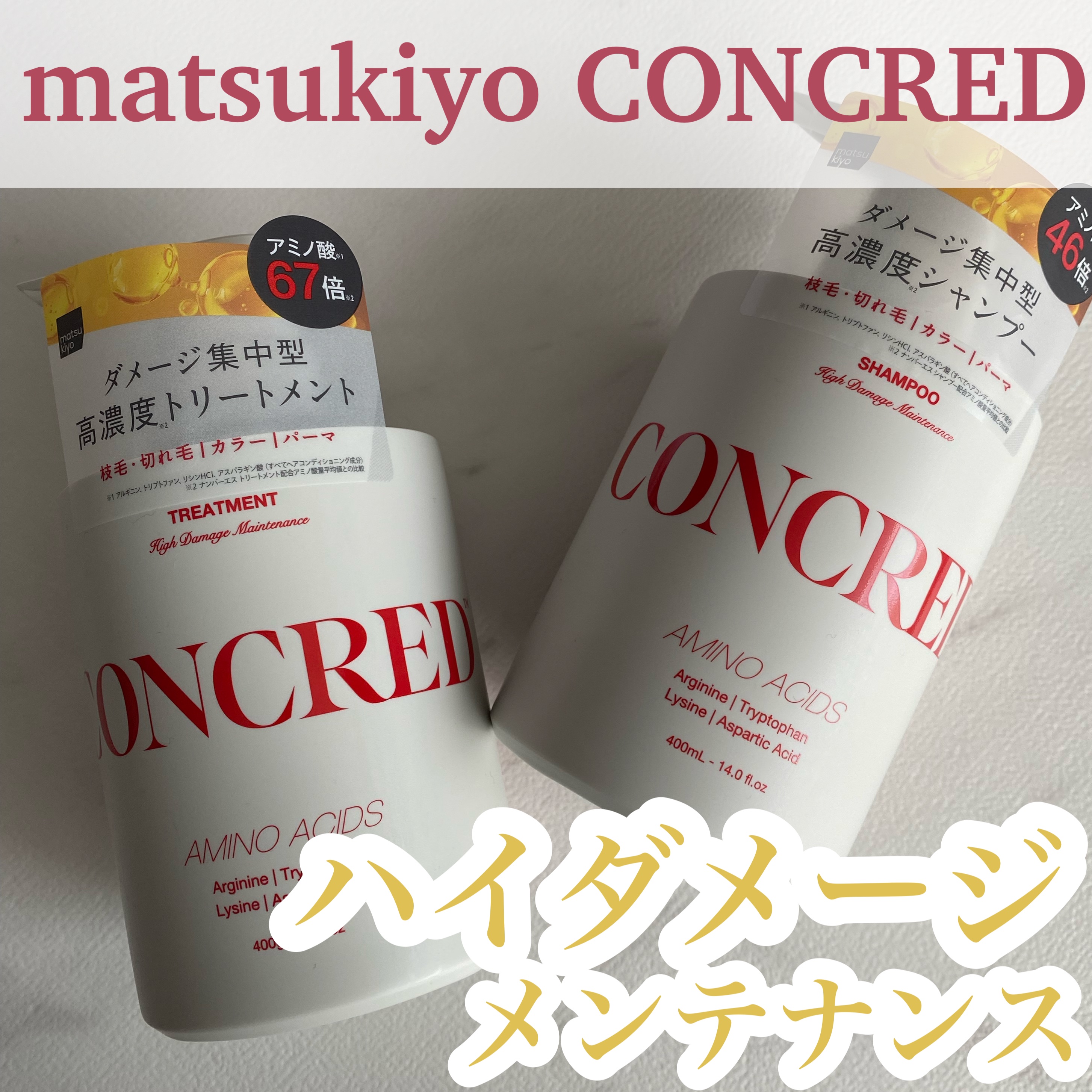 matsukiyoCONCREDハイダメージメンテナンスシャンプー/トリートメントマツキヨから新プライベートブランドのヘアケアが誕生💗ダメージ要因により流出するアミノ酸が高濃度配合*されているんだそう✨ヘアダメージ別に洗浄剤・補修成分を厳選配...