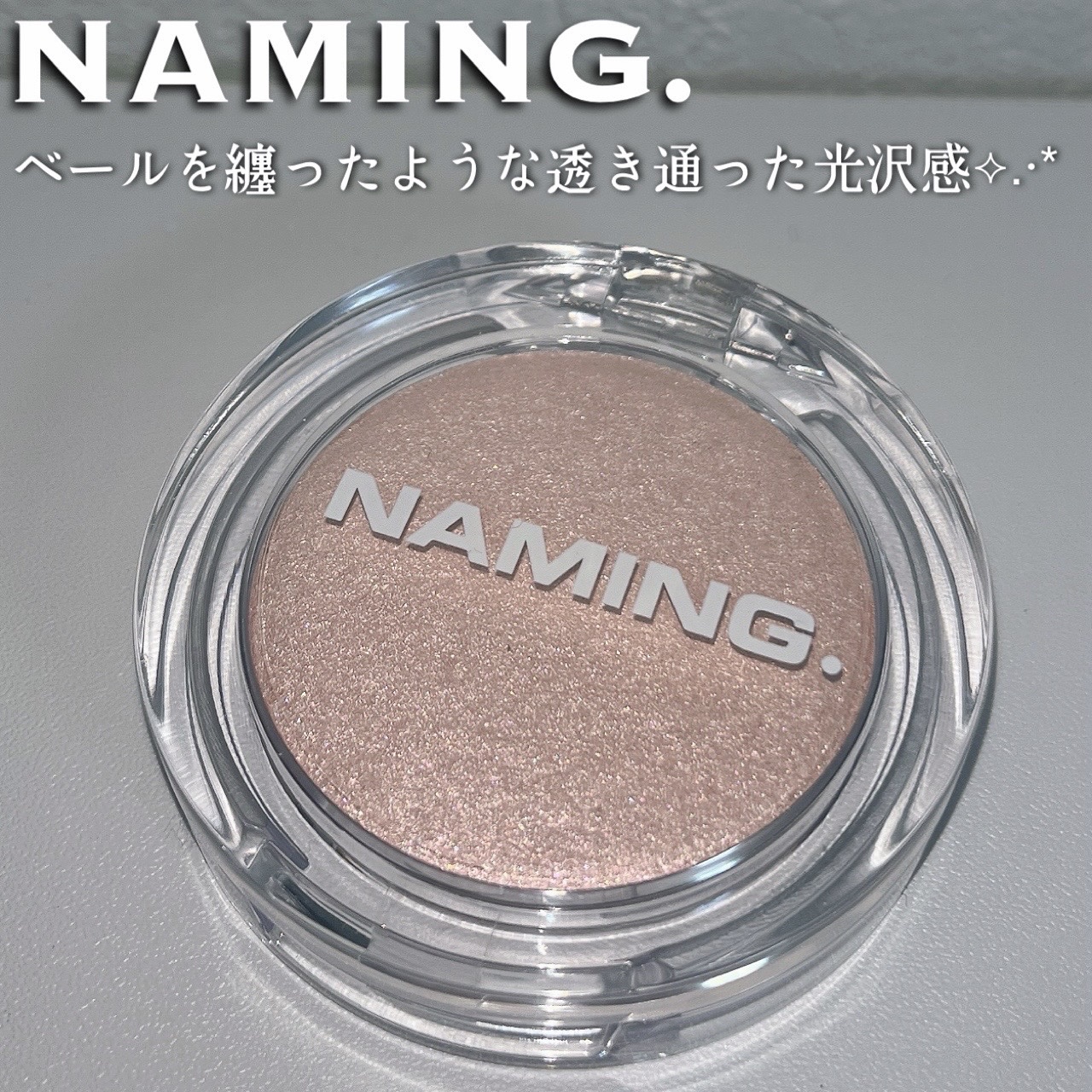 韓国発のコスメブランドNAMING.のハイライター✴︎ メイクや肌トーンに合わせた3色展開です 02はほんのりピンクみのある透明感パールで、肌が明るくみえる!! アイシャドウとして使っても光でキラキラに輝いて見えてめちゃ綺麗✨