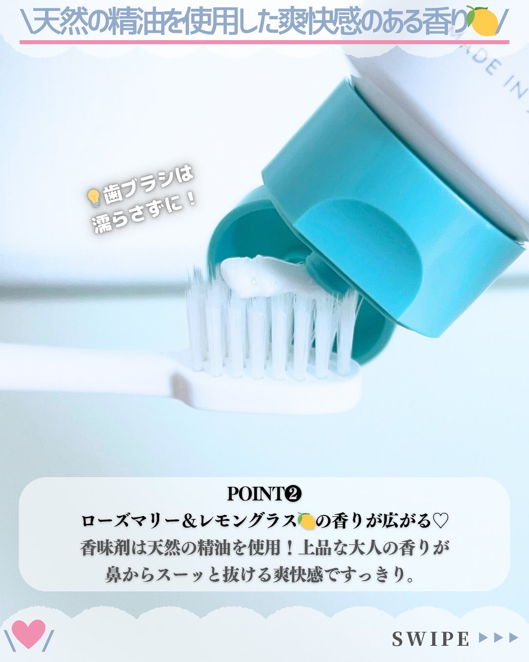 - ホタテ貝殻100%使用した良質なヒドロキシアパタイトを使用し、歯の表面を滑らかに、ツヤのある歯へと導きます。 低発泡で丁寧にブラッシングする事ができ、天然の精油を使用したレモングラスとローズマリーの香りが、鼻からスッと抜ける爽快感があります。