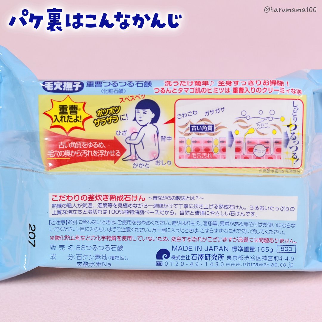 毛穴撫子重曹つるつる石鹸【内容量】155g【参考価格】¥800+taxコスパ ★★★☆☆匂い ★★★☆☆使用感 ★★★☆☆ずっしりと重めの石鹸。ペリカン石鹸より固めな印象。なので減りも緩やかでコスパはいい方。二の腕ザラ付きが気になり購入しまし...
