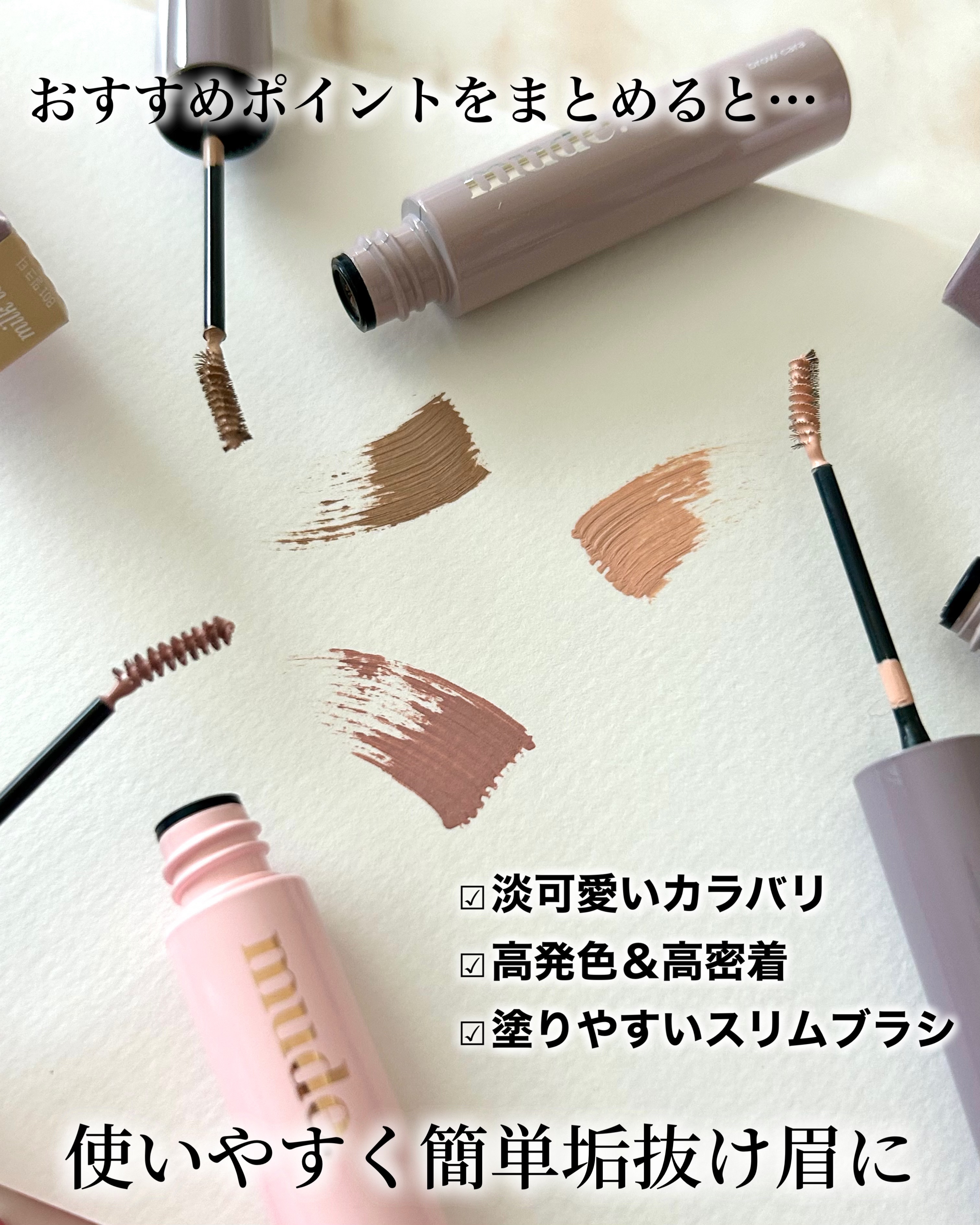 mude様のインスパイアスキニーブロウカラーについてのレビューです✨🎀1本1本を自然に整えてくれる、ムードバランスを演出するナチュラルカラーセットアップブロウカラー🩷高速フィクシングで軽やか&ふんわり仕上がるナチュラルテクスチャー🩷密着感のあ...