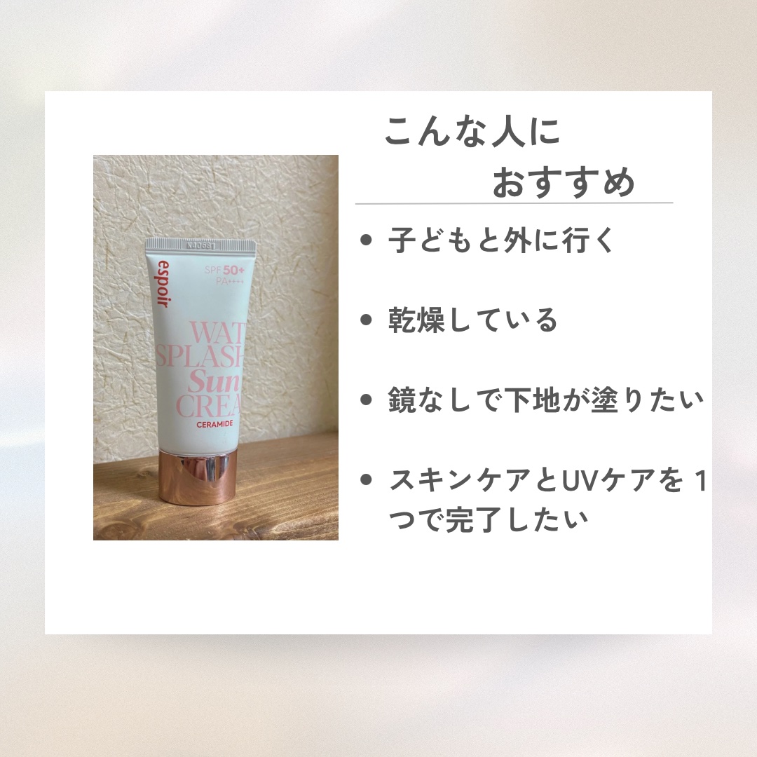 espoir日焼け止め🤍🤍🤍🤍🤍🤍🤍🤍🤍🤍『よいけどベタベタするよトーンアップ感』娘💗言ってたespoirウォータースプラッシュサンクリームセラミド60mlエスポア下地気になってる方はチェックしてみてください※個人の感想です#espoir#ウ...