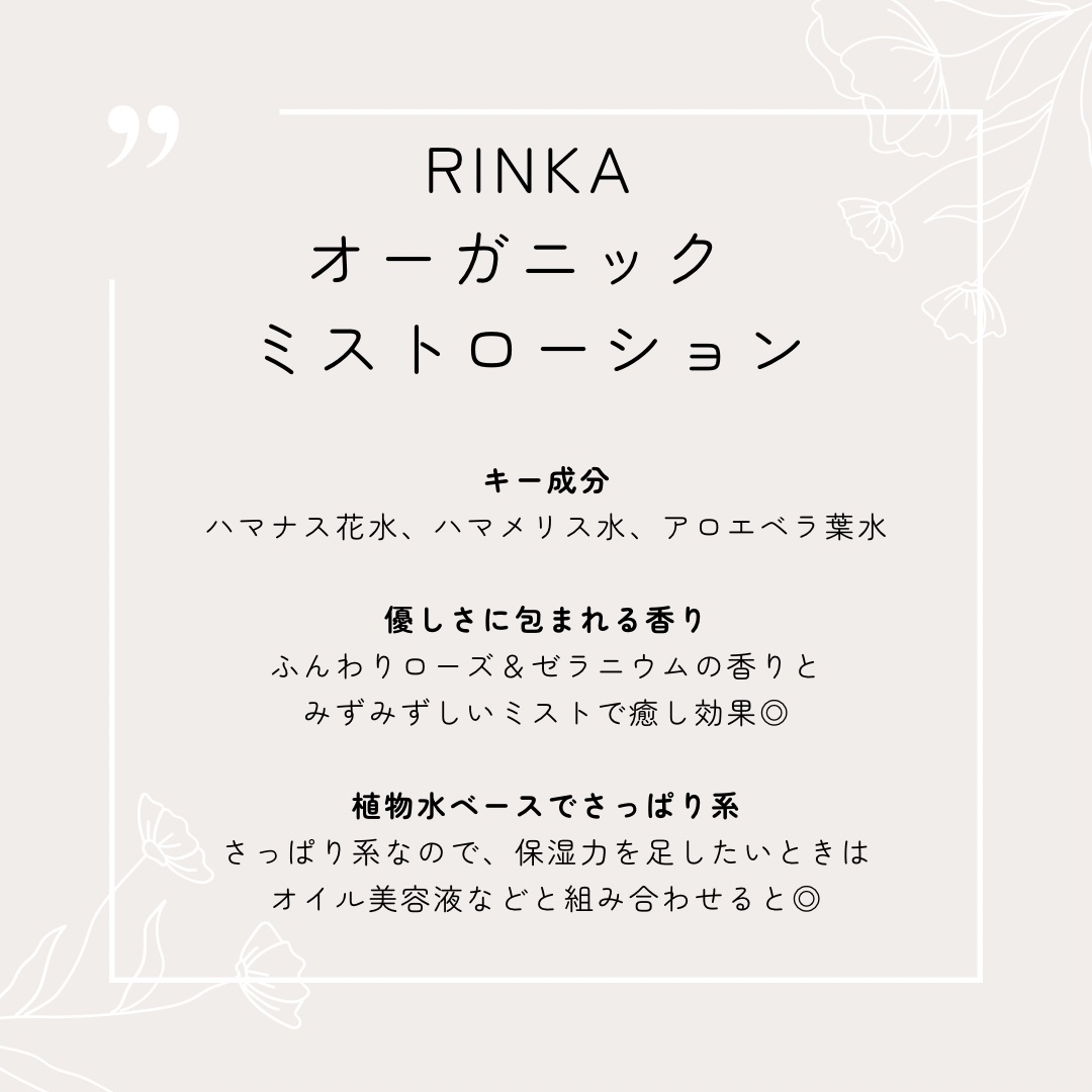 シンプルな成分でできているところが気に入っている化粧水です。 みずみずしいミストシャワーを顔全体に浴びると、とても気持ちがよいです。 エタノールと精油が無配合です。肌コンディションを問わず使えるので、重宝しています。 ハーバルでフレッシュな香りがします。自然そのままという感じの香りなので、使うたびに癒されます。