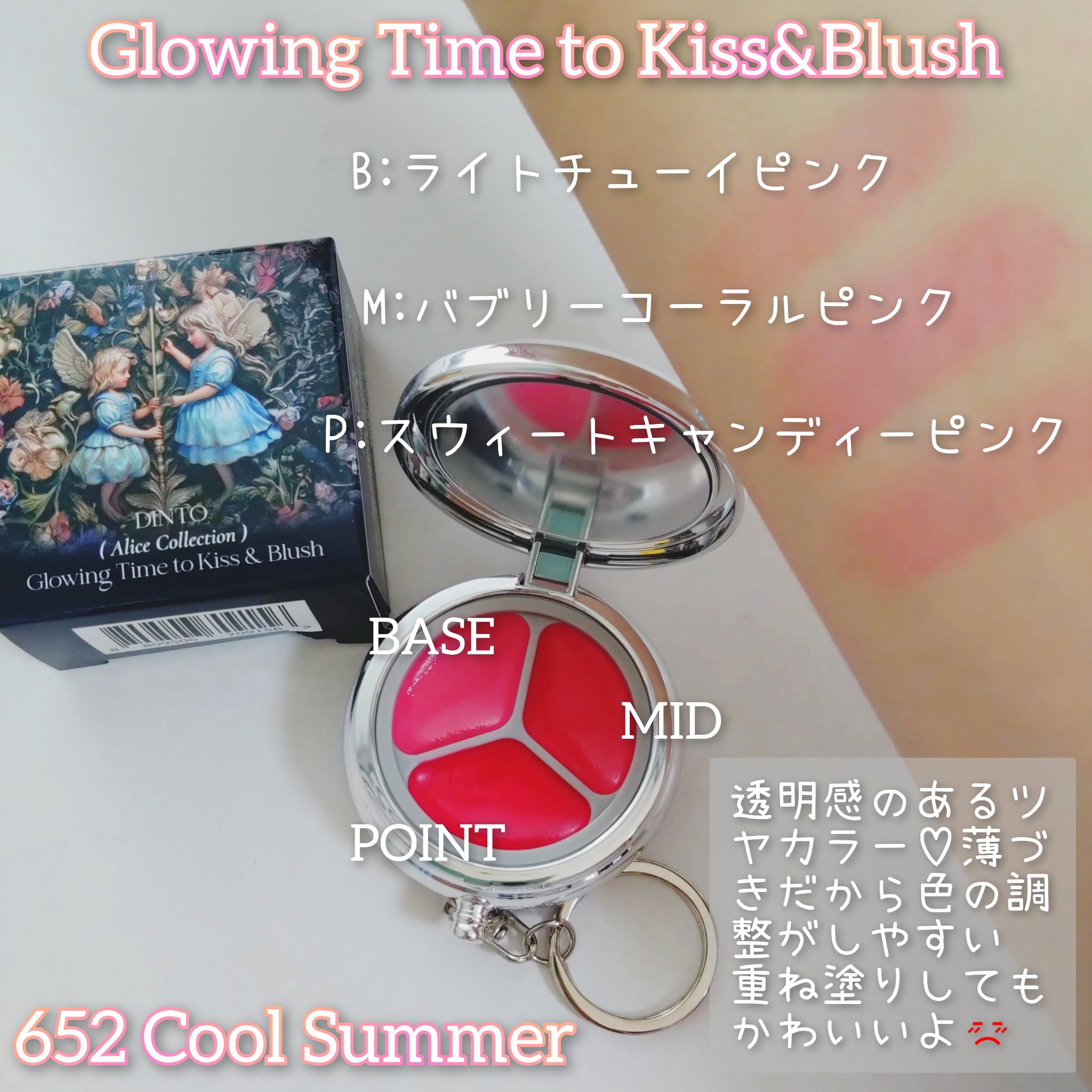 Dintoさまからいただきました🎁☑︎Dinto【アリスコレクション】ブラーリングタイムトゥーキスアンドチーク601ウォームスプリング/652クールサマーパケかわいすぎ😭!!大優勝😭!!パカっと開けるとなかには3色のリップ&チーク🙌マットタイ...