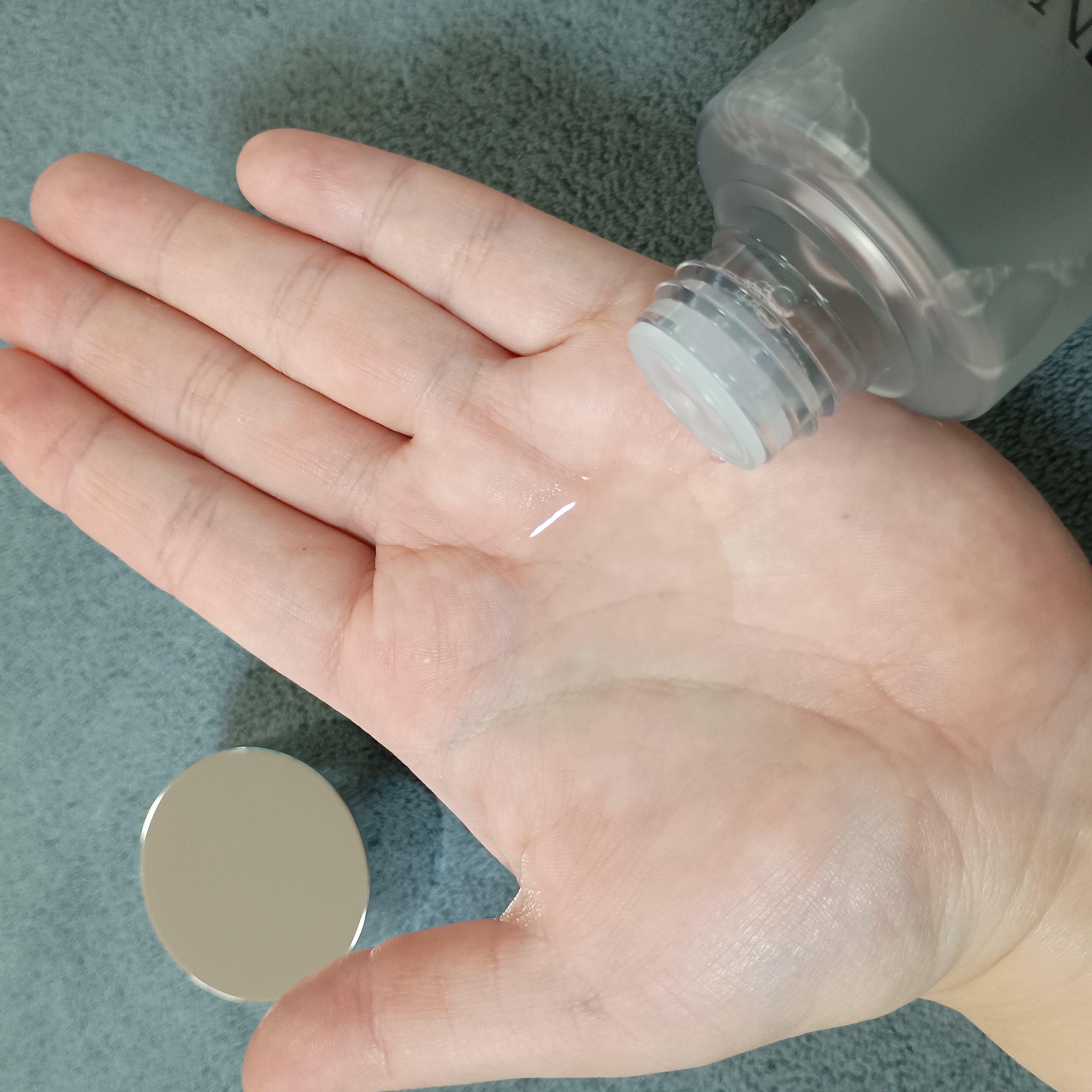 透明のジェルで固めのテクスチャー。かなり粘度の高いことが写真から分かるでしょうか?ハチミツとか水あめくらい濃厚です!! お肌に付けると温かさも感じます。 伸びは良くないですが使いにくいと思った場合は導入ローションを使うと良いです