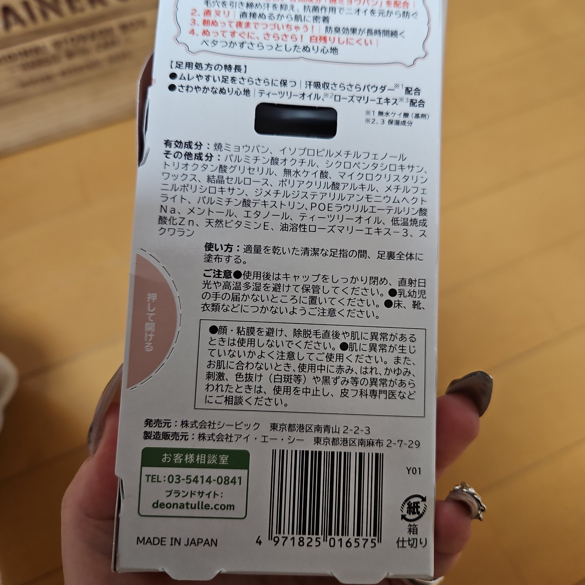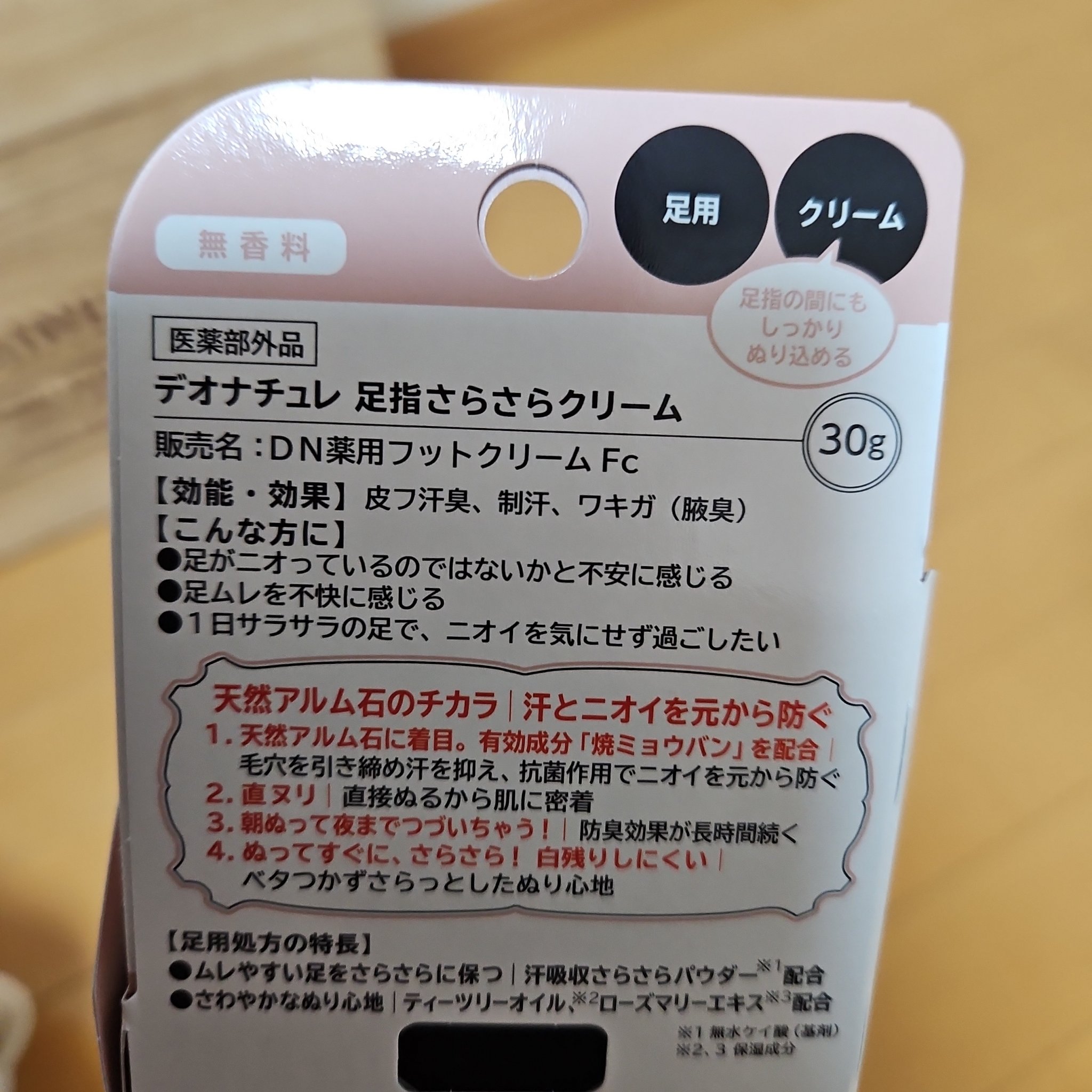 - \11年間ず~っと売上No.1*直ヌリ制汗デオドラントブランド/ 『防臭力のデオナチュレ』シリーズから、足特有のムレ・ニオイを防ぐ足用処方「薬用デオナチュレ足指さらさらクリーム」 ◆◆靴、脱ぐの⁈とドキッとすること、ありませんか?◆◆ 足は1日コップ約1杯分の汗をかき、ムレて、ニオイやすい だから、デオナチュレの足用でケア! ◆◆ユーザーから選ばれる理由◆◆ 1.天然アルム石に着目。有効成分「焼ミョウバン」を配合し、汗・ニオイを元から防ぐ! 足汗吸収さらさらパウダー**やティーツリーハーブ・ローズマリーエキス***を配合 2.ニオイの発生源に“直ヌリ”で、朝ぬって夜まで続いちゃう! 3.クリームなのに、ベタつかず・白残りしにくい ==注意== ●顔・粘膜を避け、除脱毛直後や肌に異常があるときは使用しないでください。●肌に異常が生じていないかよく注意してご使用ください。また、お肌に合わないとき、使用中に赤み、はれ、かゆみ、刺激、色抜け(白班等)や黒ずみ等の異常があらわれたときは、使用を中止し、皮フ科専門医などにご相談ください。●使用後はキャップをしっかり閉め、直射日光や高温多湿を避けて保管してください。●乳幼児の手の届かないところに置いてください。●床、靴、衣類などにつかないようご注意ください。 販売名:DN薬用フットクリームFc *インテージSRI+直ヌリ制汗剤市場(形状:ロールオン・スティック・クリーム・ジェル・パウダー) 2013年5月~2024年4月 デオナチュレシリーズ 累計販売金額 **基剤:無水ケイ酸 ***保湿成分