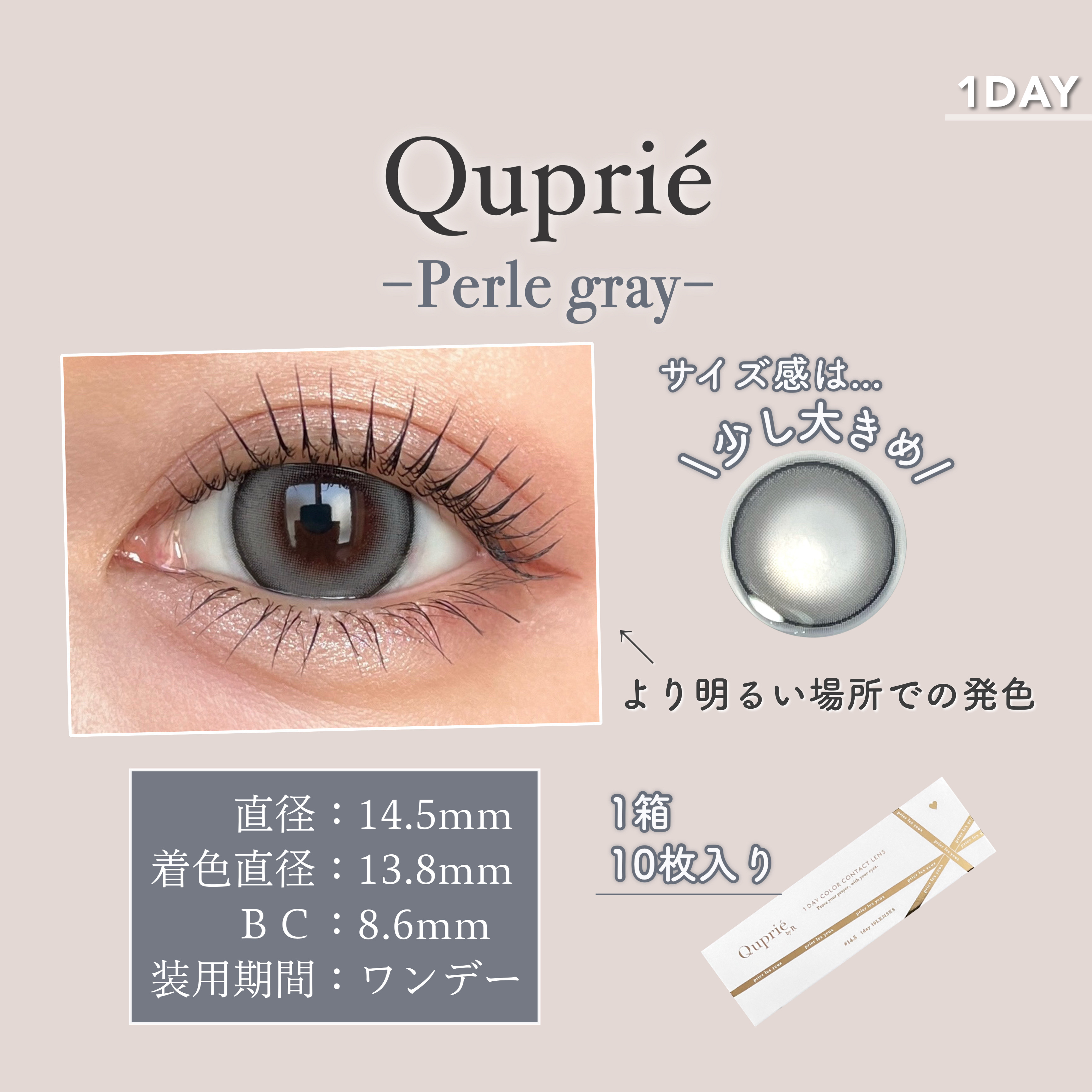 - キュプリエは“派手過ぎず上品な発色なのに、しっかり盛れるサイズ感”にこだわった、大人の女性のためのカラコン。 付けるだけで華やかな印象になり、女性も男性も魅了する、魔性の瞳に。 メイクやファッションに合わせて色んな変化を楽しめる4つのカラーバリエーションで、 デートや、女子会、お仕事などさまざまなシチュエーションに合わせてお使い頂けます。 カラーコンタクトレンズの不適正使用による眼障害の危険性等などがあります。 ●コンタクトレンズは高度管理医療機器です。不十分な洗浄・消毒など不適切なケアや、長時間・交換期間を超えた装用により、アレルギー性結膜炎、角膜感染症、角膜潰瘍等の重篤な眼障害が発生する危険性があります ●ご使用前に取扱説明書を確認してください 使用上の留意事項 ●眼科医院等を受診してからお求めください ●眼に異常を感じたら直ちにレンズ使用を中止し、お近くの眼科等で診察を受けてください ●医師の指示にしたがってご使用ください ●コンタクトレンズを装用する場合、自覚症状がなくても、眼科医院等での定期検査を受けてください ●レンズに不具合がある場合は使用しないでください