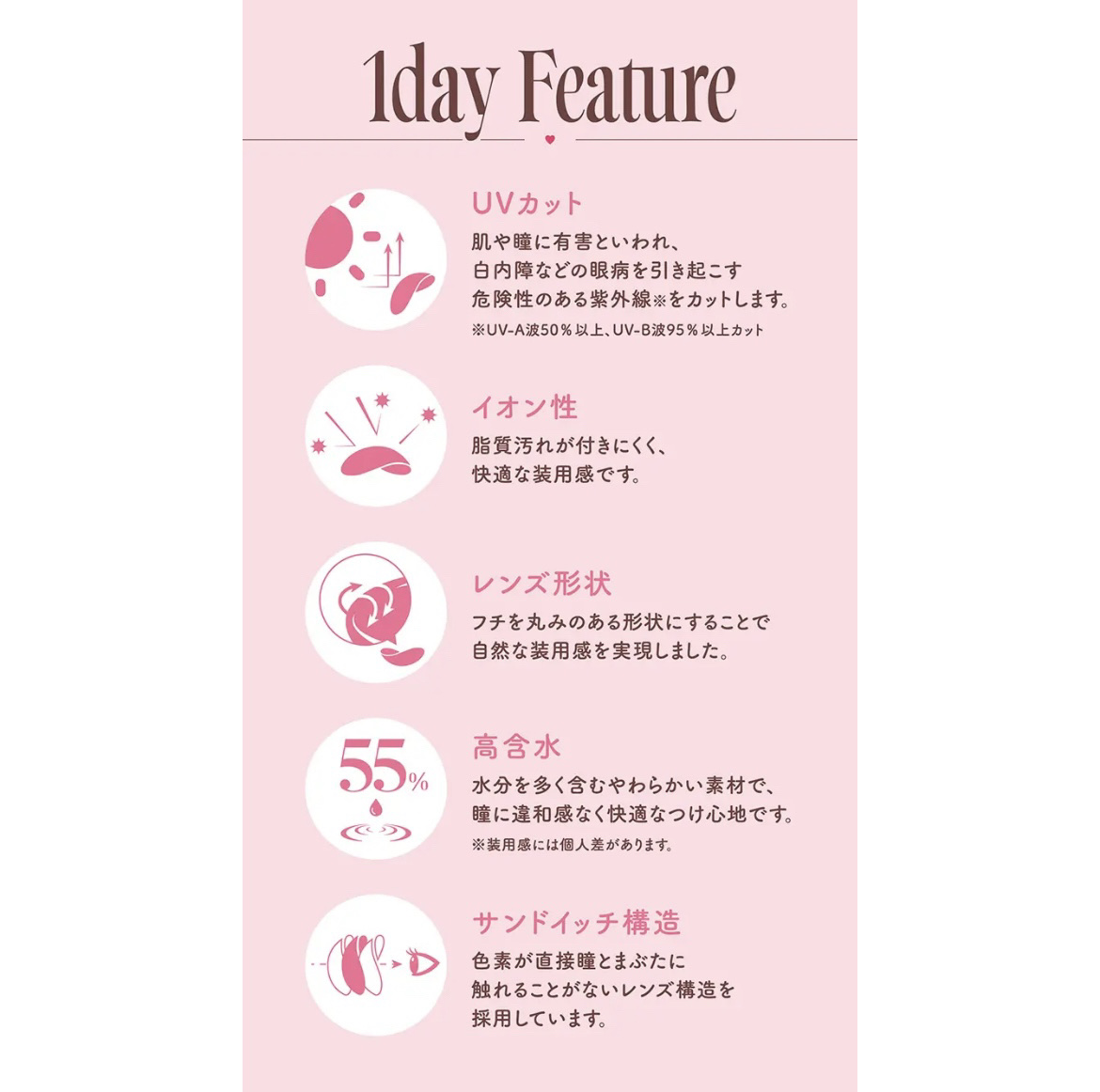 - ※2025年6月以降、商品パッケージ裏面・側面の一部表記を変更いたします。尚、これにかかる商品の交換・返品は承っておりません さりげなくいつもと違う自分をアピールしたい。 そんな女の子たちにいつまでも「いま欲しい!」と思ってもらえるレンズを目指してデザインしました。 落ち着きすぎず、明るすぎない、ナチュラルサイズで目になじみながら発色を感じられるデザインをそろえています。 カラーコンタクトレンズの不適正使用による眼障害の危険性等などがあります。 ●コンタクトレンズは高度管理医療機器です。不十分な洗浄・消毒など不適切なケアや、長時間・交換期間を超えた装用により、アレルギー性結膜炎、角膜感染症、角膜潰瘍等の重篤な眼障害が発生する危険性があります ●ご使用前に取扱説明書を確認してください 使用上の留意事項 ●眼科医院等を受診してからお求めください ●眼に異常を感じたら直ちにレンズ使用を中止し、お近くの眼科等で診察を受けてください ●医師の指示にしたがってご使用ください ●コンタクトレンズを装用する場合、自覚症状がなくても、眼科医院等での定期検査を受けてください ●レンズに不具合がある場合は使用しないでください