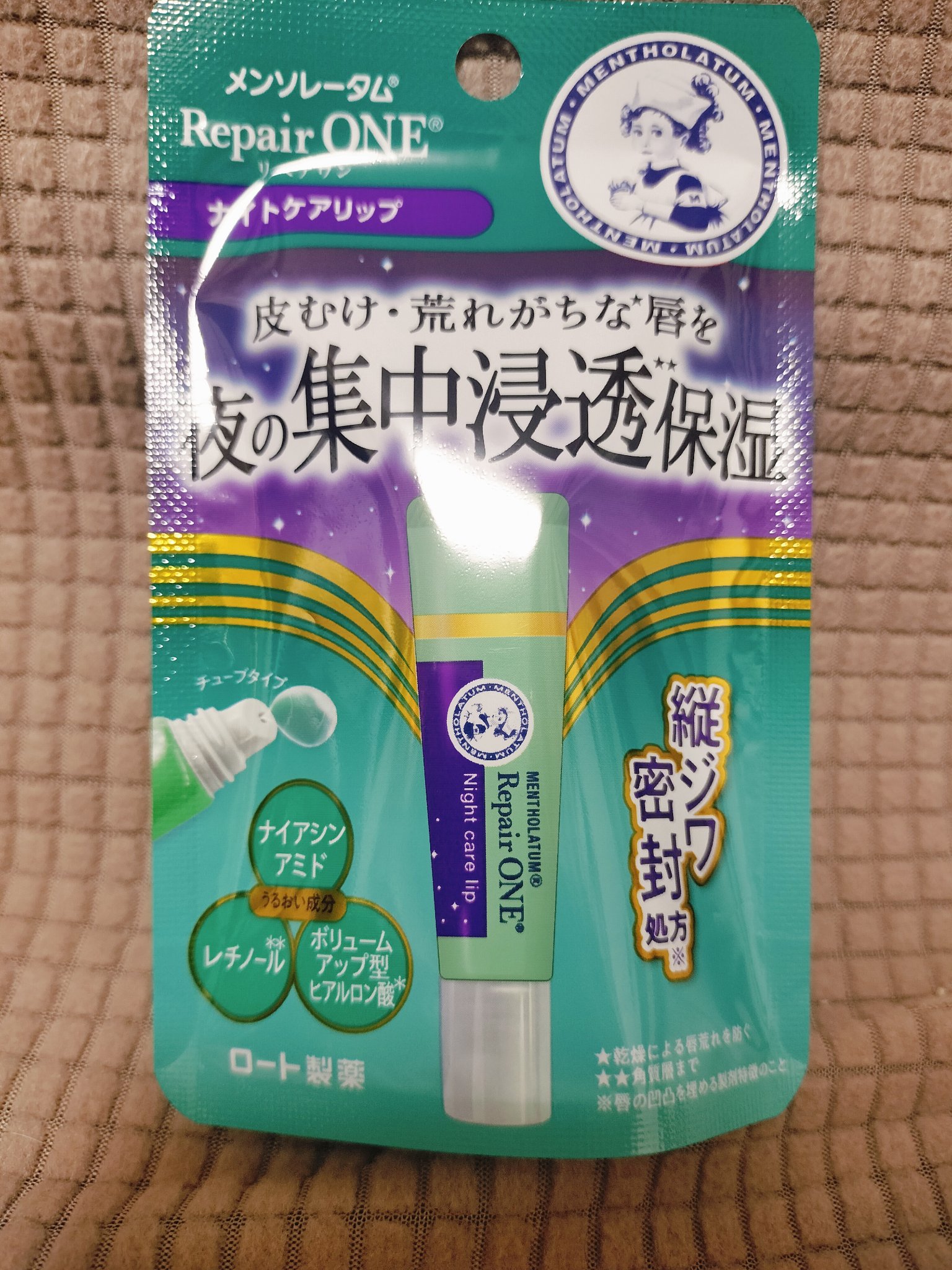 - ※商品パッケージは予告なく変更する場合がありますのでご了承ください。 「メンソレータム リペアワン ナイトケアリップ」は夜塗って集中浸透*1、3つの美容液成分(うるおい成分)配合で保湿パックできるリップエッセンスです。 唇をすこやかに保って荒れを防ぎ、ふっくらとうるおいのある唇に導いてくれます。 さらに、チューブタイプで使いやすく、のびがよく唇の凹凸を埋める縦ジワ密封処方*2も特徴的。 夜塗ってふっくらうるおった唇へ。 *1角層まで *2唇の凹凸を埋める製剤特徴のこと