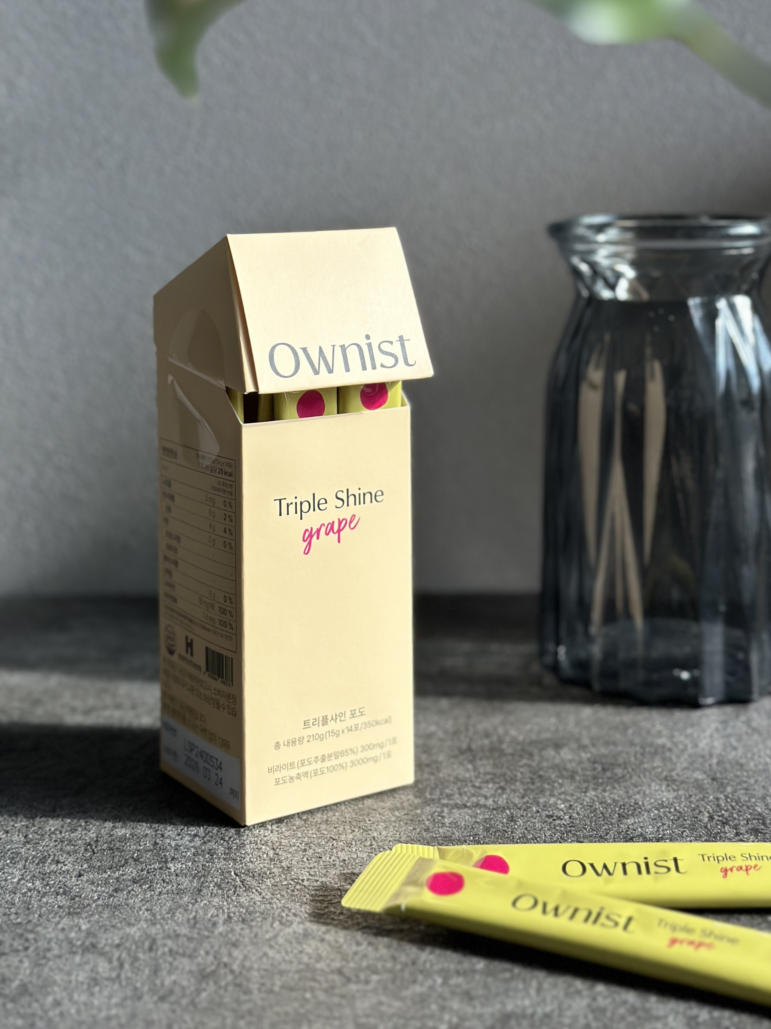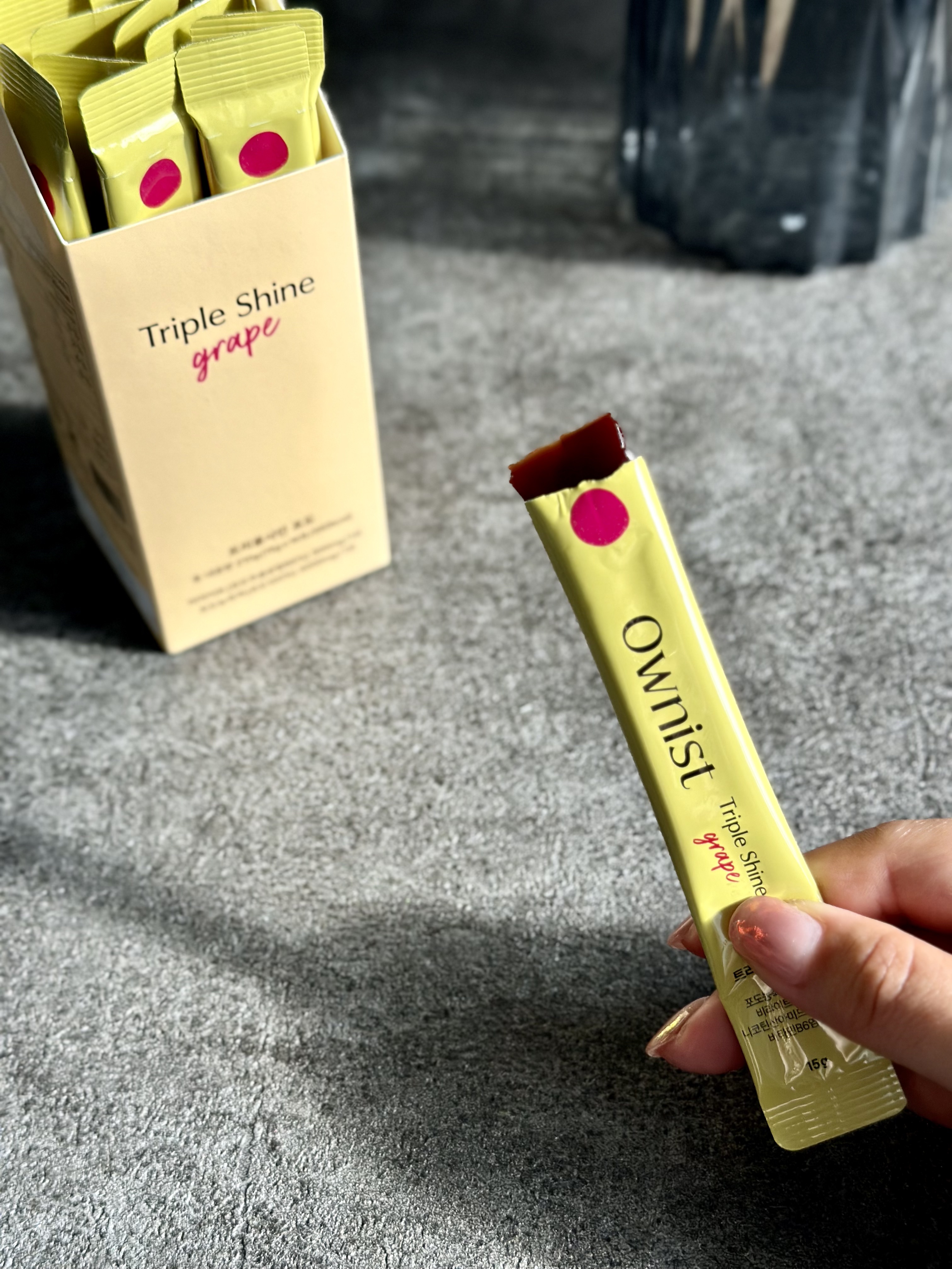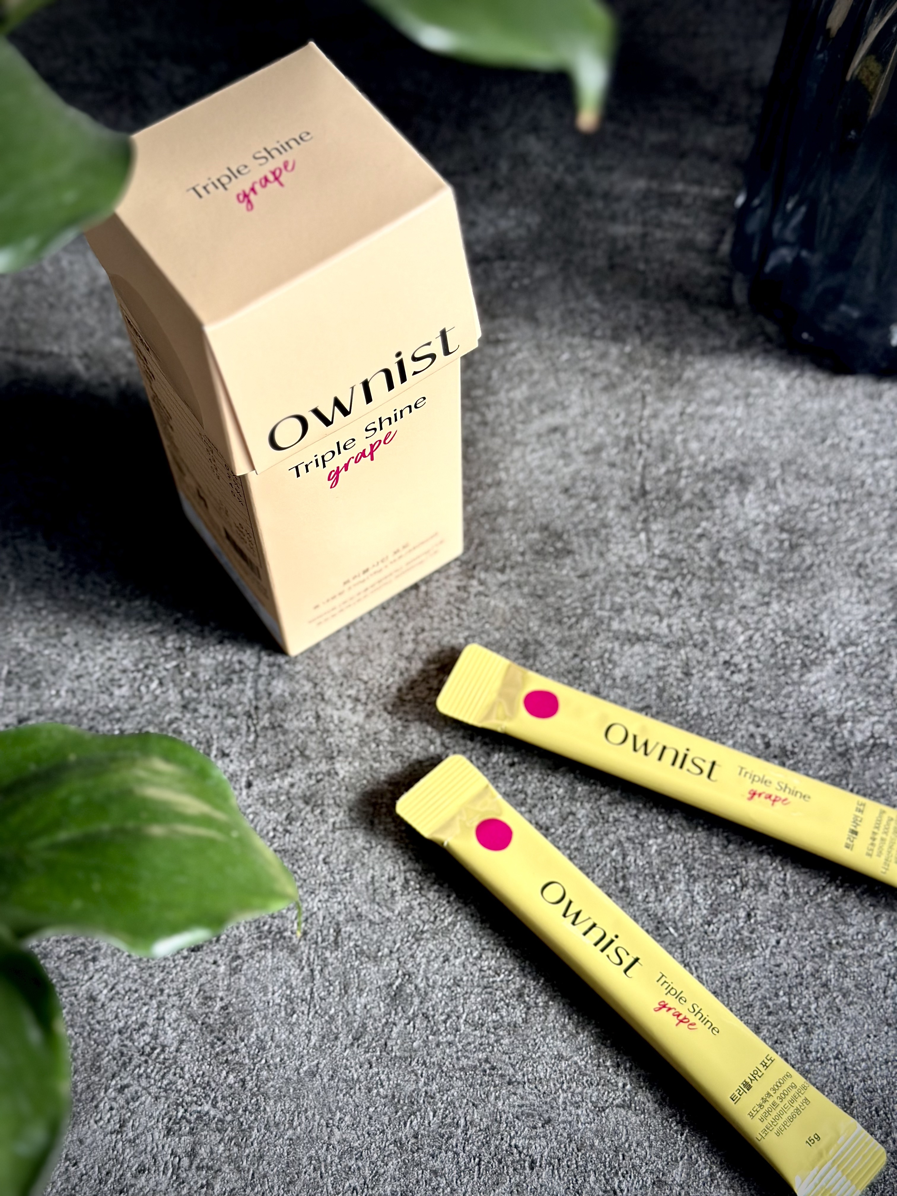 \飲む日焼け止めで/\内側からUVケア/甘酸っぱいぶどう味!「オニストトリプルシャイン」の紹介です!Ownist(オニスト)は、韓国の有名デパートTheHyundaiや免税店でも販売されている人気のインナービューティーブランドで、POPUPス...