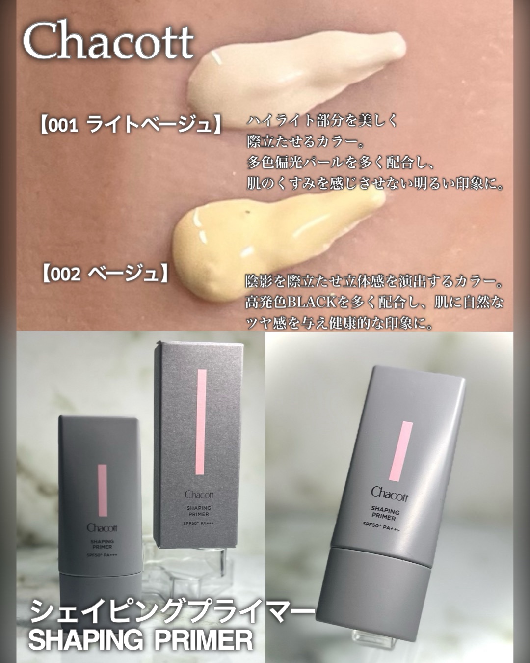 チャコットさまからいただきました。シェイピングプライマー001ライトベージュ002ベージュSPF50+/PA+++・紫外線吸収剤フリー。コントゥアリングをプライマーで簡単に!塗るだけでナチュラルな立体感を演出。陰影を引き出す#塗るだけメリハリ...