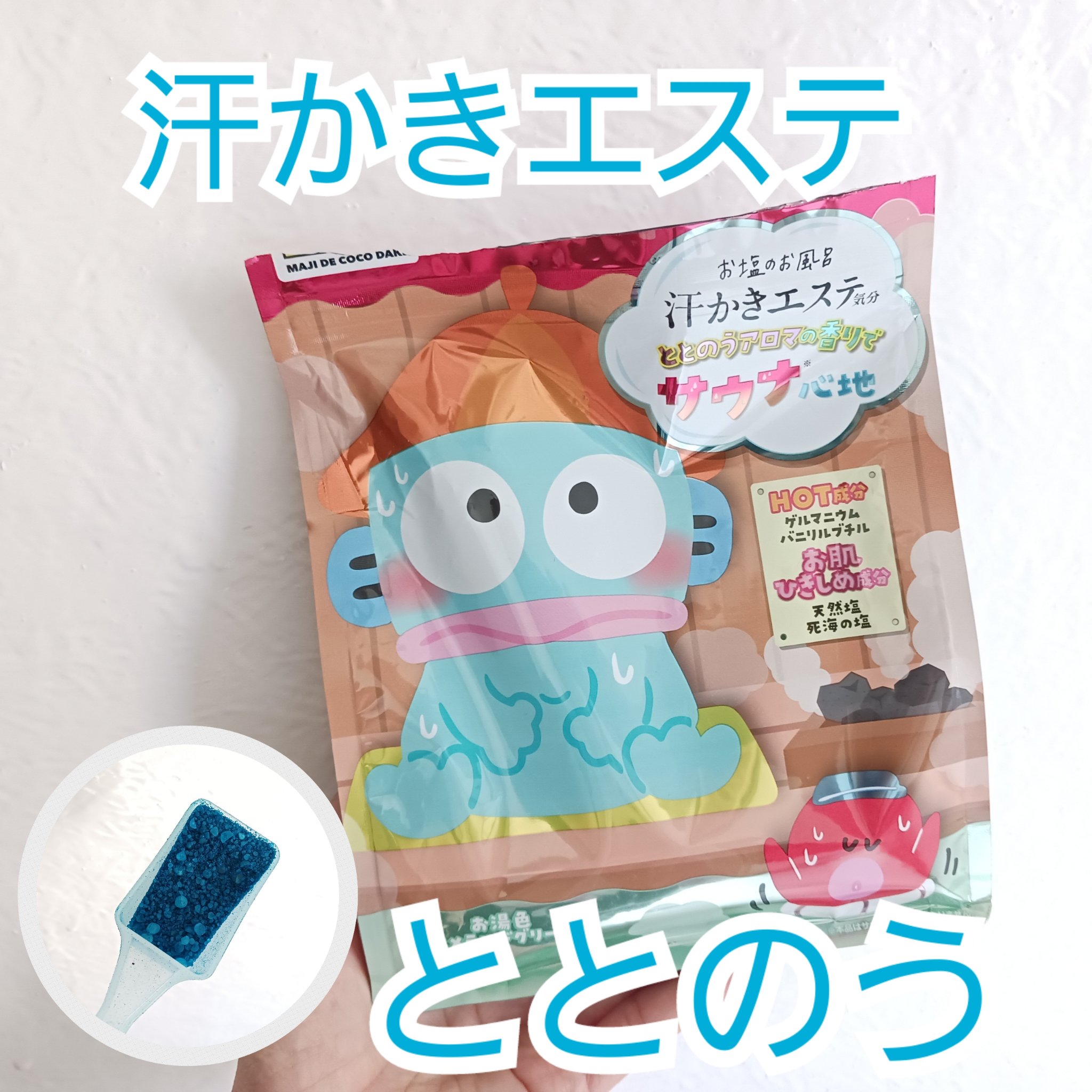 こちらはマツモトキヨシ&ココカラファイン限定商品✨ 「汗かきエステ気分」とハンギョドンがコラボしていてパッケージがとっても可愛い😍 「サウナ心地」はHOT成分(ゲルマニウム、バニリルブチル)を配合していてドバっと汗を出し気分をリセット☀️ 「ととのうアロマの香り」はリラックスできるいい香りで心地よく入浴できました👍