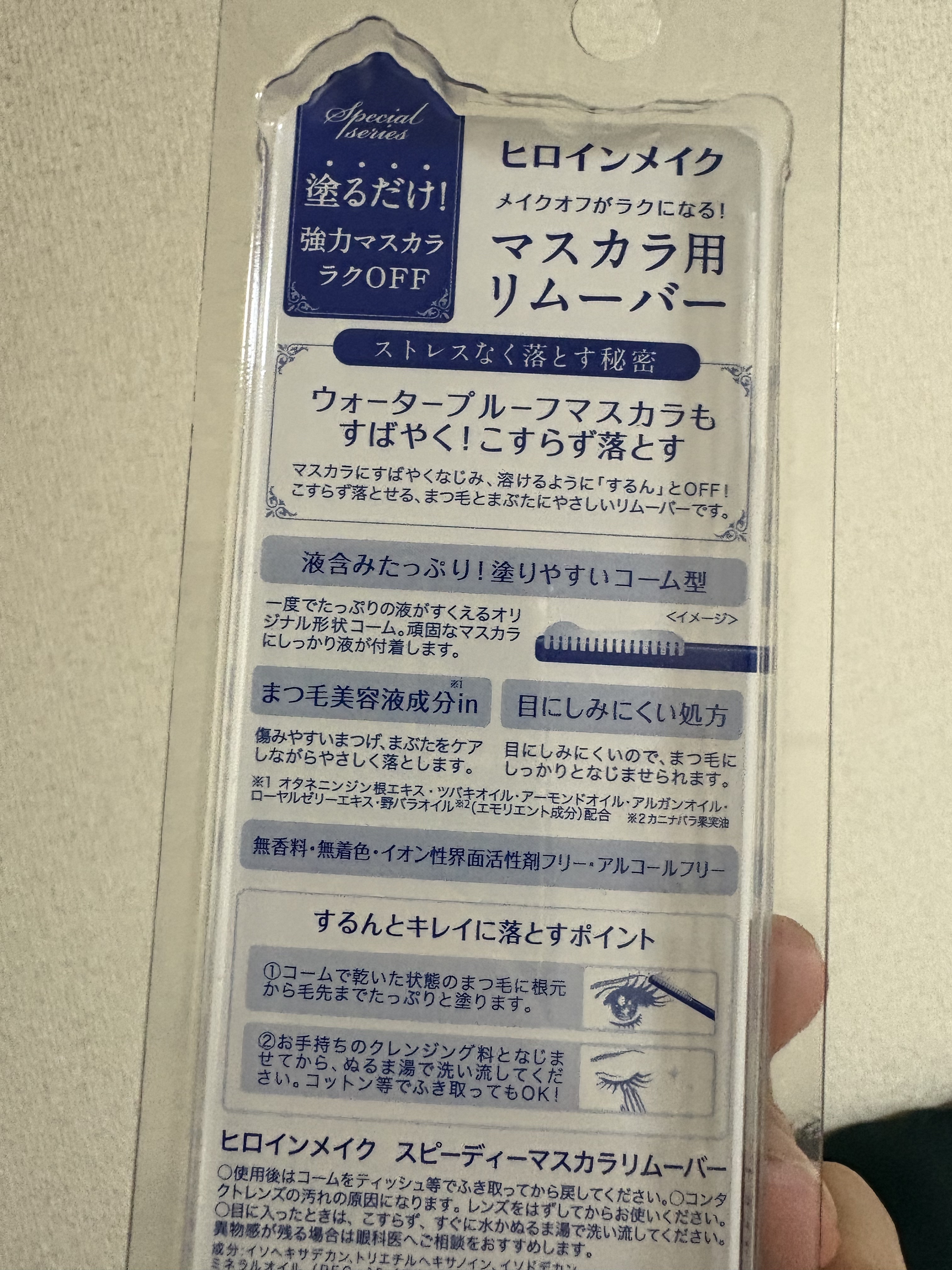 - ※2025年10月〜「水色ボトル」の パッケージを順次リニューアル。尚、これにかかる商品の返品・交換は承っておりません。 ■落としやすさ UP!ゴシゴシせずに簡単にメイクオフ 洗浄力の高い成分の配合量をアップ。よく落ちる!とクチコミでも話題の自社従来品よりも、リムーバーを塗布してから早い時間でマスカラとなじみ、ウォータープルーフマスカラも素早く落とします。 ■ひと塗りでたっぷり塗れ、楽々オフするコーム コーム1本1本の間隔を広げ、溝も深く改良した新コームを採用。コームへの液含みが増えることで、ひと塗りでたっぷり塗ることができ、とかすだけでよりスピーディーに簡単にマスカラを落とします。 ■まつ毛に優しい使い心地で、健やかに保つ ヒロインメイク アイラッシュセラム(まつ毛美容液)に配合されているまつ毛ケア成分(保湿)も配合しました。毎日のアイメイクで負担のかかりやすいまつ毛にうるおいを与え、健やかに保ちます ■目に配慮した処方 デリケートな目もとに使うものだから、界面活性剤不使用で目に配慮した処方です。 ■無香料・無着色・アルコールフリー・イオン性界面活性剤フリー・皮フ刺激テスト済み* *全ての方に皮フ刺激が起こらないというわけではありません。