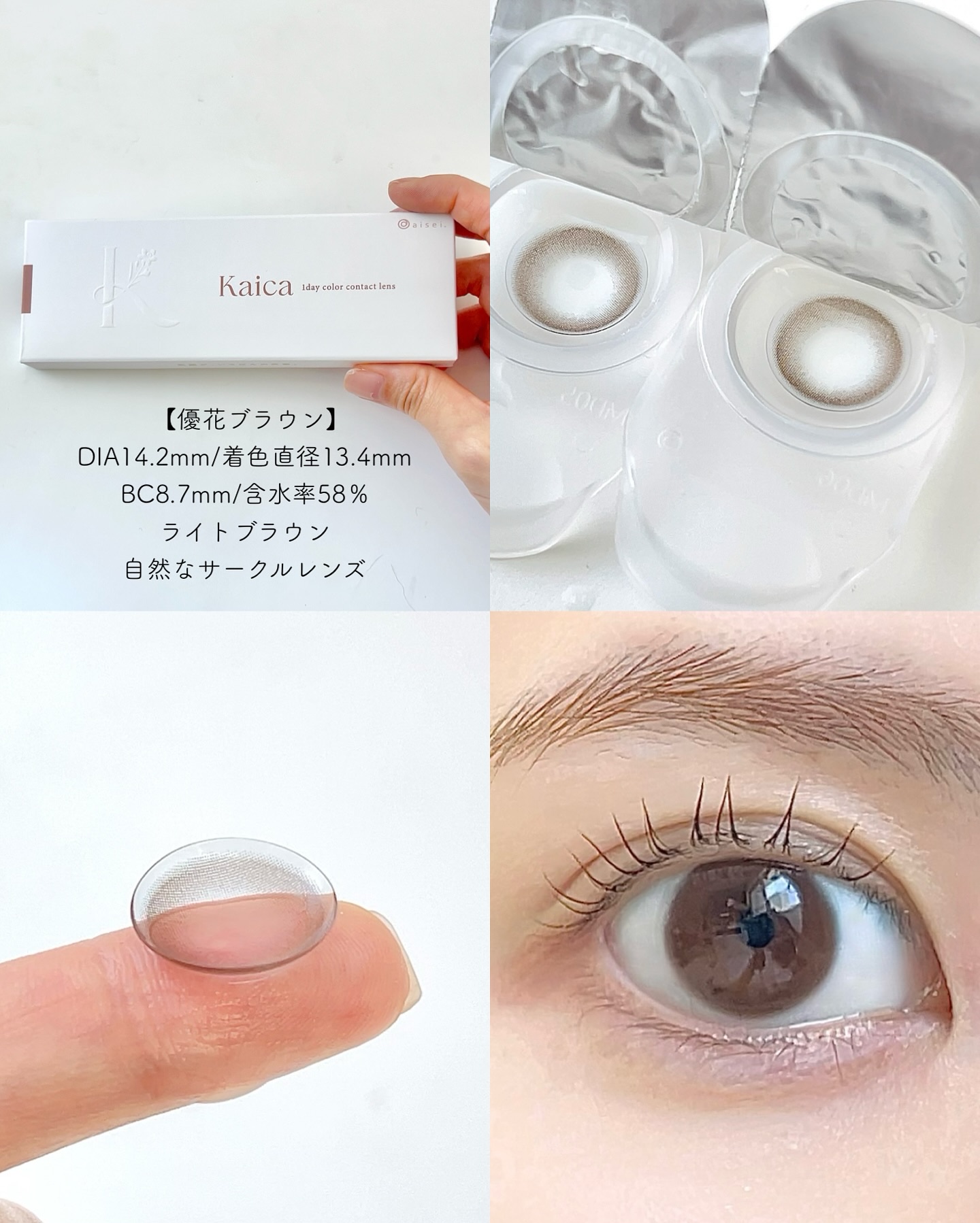 - 『Kaica』のレンズは全て「人口っぽさ」をできるだけなくし、間近で見てもカラコンをしていることがバレにくいデザイン設計。 まるでオーロラのように美しい彩りのヴェールを瞳にまとったかのような仕上がりになるのが特徴です。 裸眼の色に左右されることなく、黒目さんでも茶目さんでも、色が浮くことなくキレイに色が溶け込むように馴染むため、裸眼を活かしながら透明感を瞳に与えることができます。 2025年4月発売 <月絃ベージュ> 今っぽトレンドのトーンアップベージュ。愛らしさをプラスしてくれる、ちゅるん系レンズ <咲初ショコラ> 瞳をきらっと魅せる王道ダークブラウン。どんなシーンでも迷わず使える、実力派レンズ。 <淡花ヌード> 儚げでミュートな淡色ブラウン。とことん裸眼に馴染む、ナチュラルを追及したレンズ。 <透花ヴェール> こだわりの透明感を叶える幻想的なヘーゼルブラウン。どんな瞳も儚く魅せる、色素薄い系レンズ。 <優花ブラウン> 瞳のトーンアップを演出する柔らかいライトブラウン。自然に瞳を印象づける、サークルレンズ。 <優月ブラック> 瞳に透明感を与える優しげなブラック。自然に瞳を印象づける、サークルレンズ。 カラーコンタクトレンズの不適正使用による眼障害の危険性等などがあります。 ●コンタクトレンズは高度管理医療機器です。不十分な洗浄・消毒など不適切なケアや、長時間・交換期間を超えた装用により、アレルギー性結膜炎、角膜感染症、角膜潰瘍等の重篤な眼障害が発生する危険性があります ●ご使用前に取扱説明書を確認してください 使用上の留意事項 ●眼科医院等を受診してからお求めください ●眼に異常を感じたら直ちにレンズ使用を中止し、お近くの眼科等で診察を受けてください ●医師の指示にしたがってご使用ください ●コンタクトレンズを装用する場合、自覚症状がなくても、眼科医院等での定期検査を受けてください ●レンズに不具合がある場合は使用しないでください