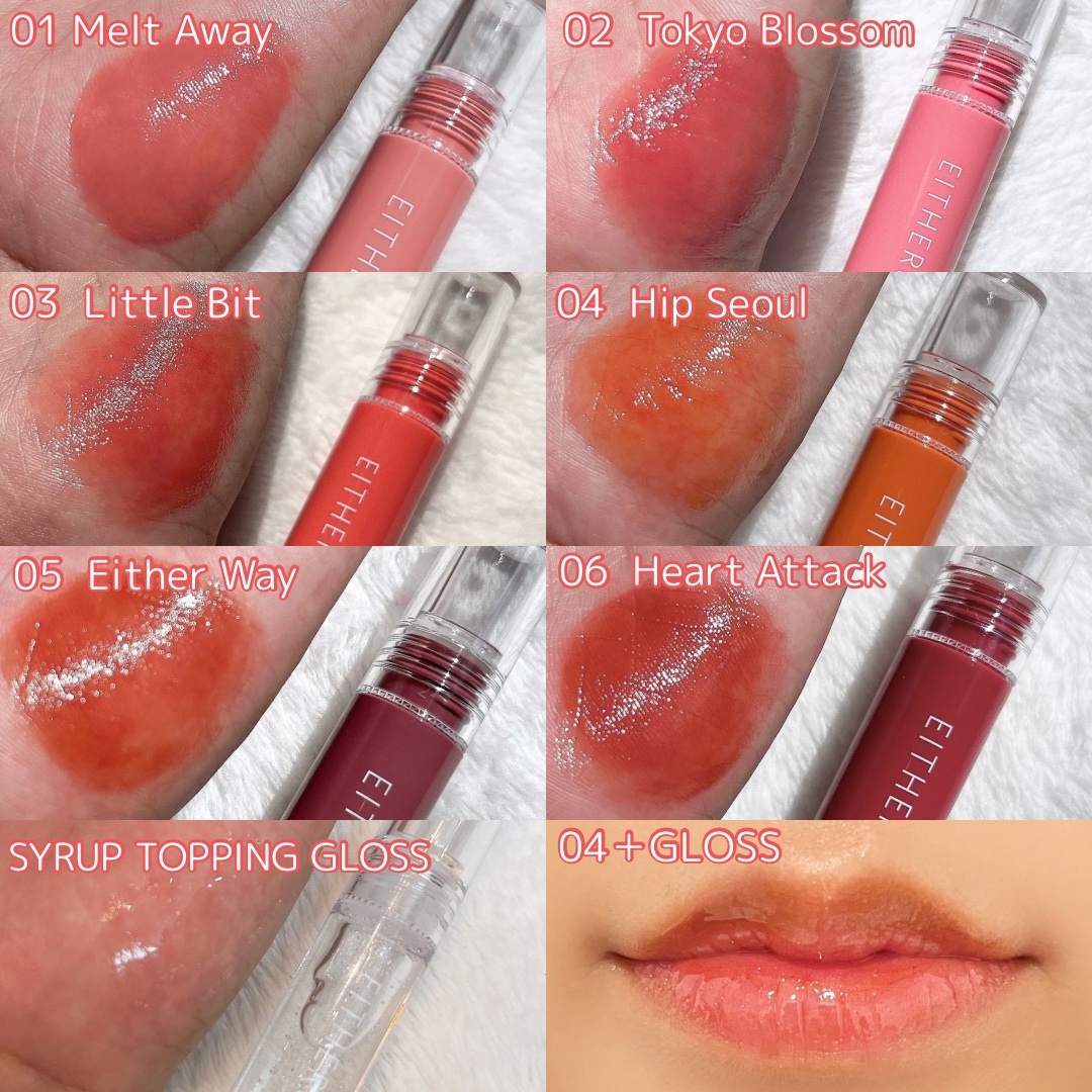 大人気のリップティントEITHER&DewySyrupTint全色レビュー透明感あるぷるんとしたつやが魅力的落ちにくく色持ちもよし!ミニサイズの全色セットをメガ割で購入したよ🙆♀️持ち歩きにもぴったり🤍イエベ春の1番好きなカラーは03LIT...