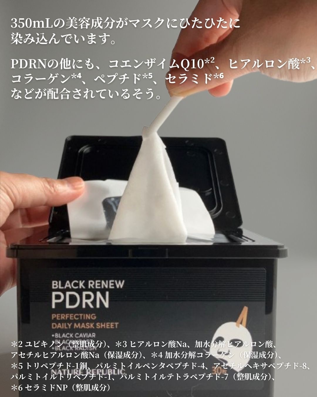 - ネイチャーリパブリックの韓国肌管理*1ラインより〈エイジングケア*2&お肌の生まれ変わりのリズムに寄りそう*3〉プレミアムシートマスクが誕生! 韓国の肌管理*1を由来とする美容成分「PDRN」に注目が集まっている中、ネイチャーリパブリックでは3種の“黒”にまつわる素材から抽出したPDRN配合のシートマスクを開発しました。 キャビア(動物由来)+黒大根(植物由来)+黒酵母(菌由来)から抽出したネイチャーリパブリック独自の超低分子PDRN Complex*を5,000ppm配合した今までにないリッチな使用感のデイリーシートマスクです。 なお、発売に先立ち2025年4月19日(土)よりロフト、ロフトネットストア※、公式オンラインストア、Qoo10、で先行発売いたします。 ※順次発売予定のため、店舗によってお取り扱い状況が異なる場合がございます。 ※一部取り扱いのない店舗がございます。 *PDRN Complex=DNA-Na:キャビア/キャビアエキス、黒酵母/酵母エキス、黒大根/ダイコン根エキスから抽出(整肌成分)、*1うるおいケアのこと *2年齢に応じたうるおいケアのこと、*3お肌を整えるスキンケアのこと