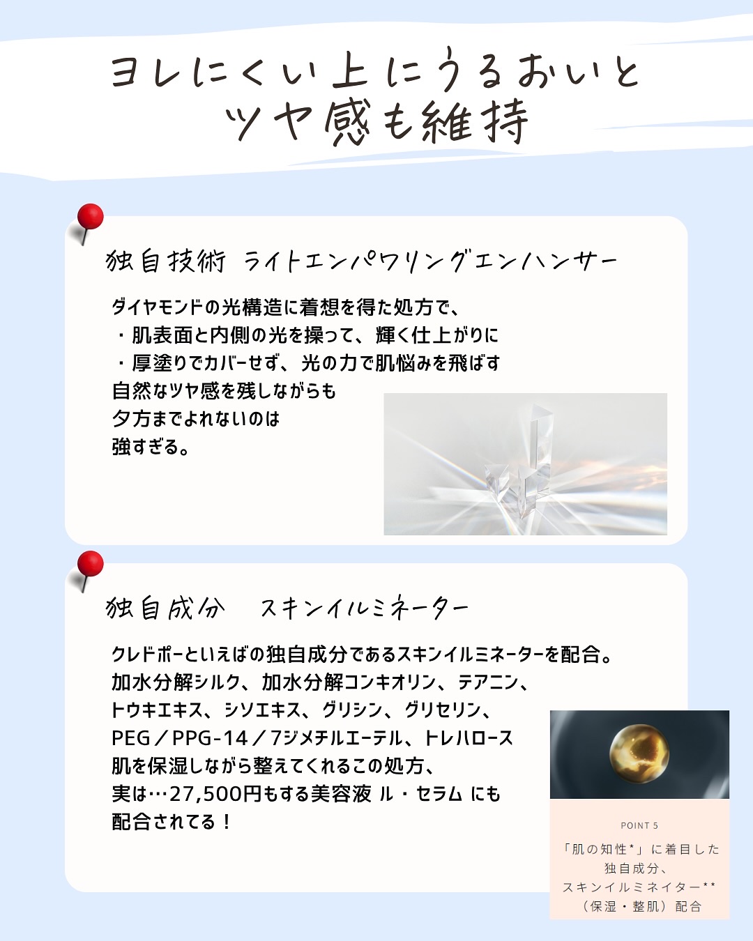 特定の有効成分を試してみたい。美容成分を試したい。そんな時は代用してもいいけど、それって似てるのかな?って思うときが正直ある。 同じ成分があっても実は濃度が違ったり、処方技術が違ったり。技術が違うと使用感も剤型も変わることがあることは知ったうえで使うといいかも。 せっかくプチプラ化粧品を買うならそれはそれで楽しんでほしいから是非念頭にいれてほしいな!!