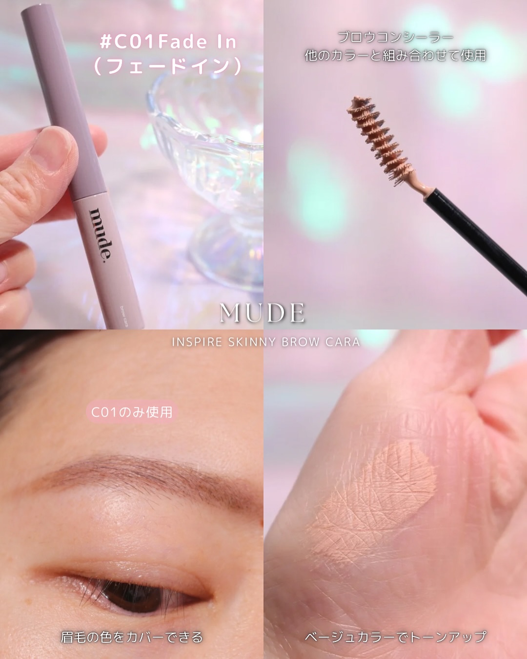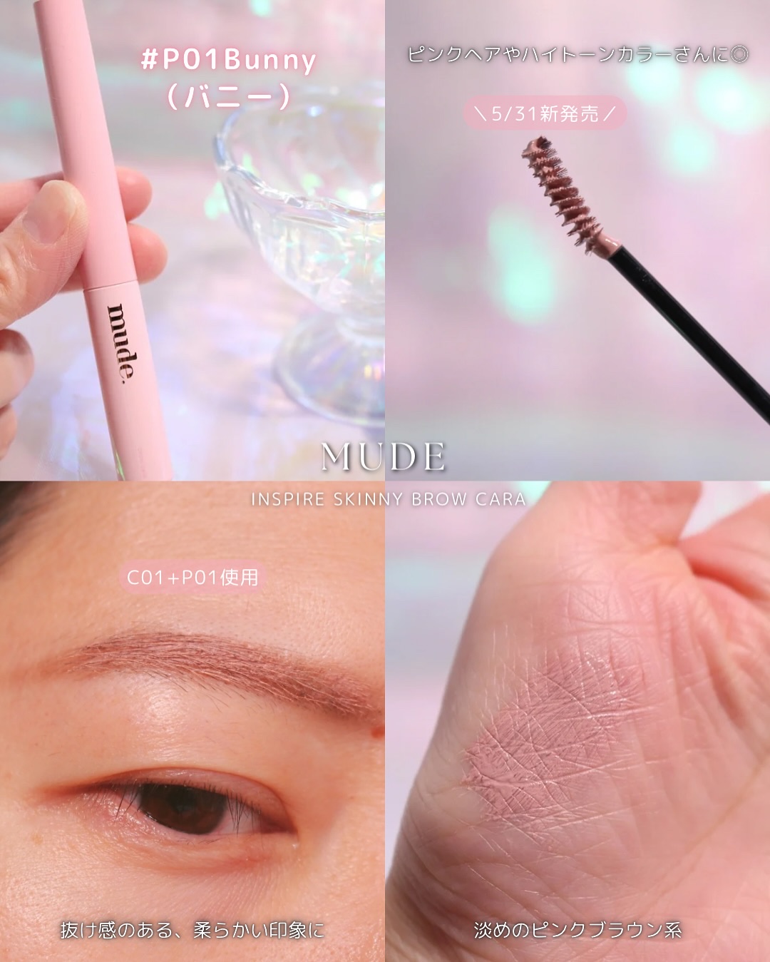 #PRmude.インスパイアスキニーブロウカラC01フェードインB01ミルクティーP01バニー🩷高速フィクシングで軽やか&ふんわり仕上がるナチュラルテクスチャー🩷密着感のある繊細なタッチでムラなく均一に発色し違和感のないナチュラルなカラーチェ...