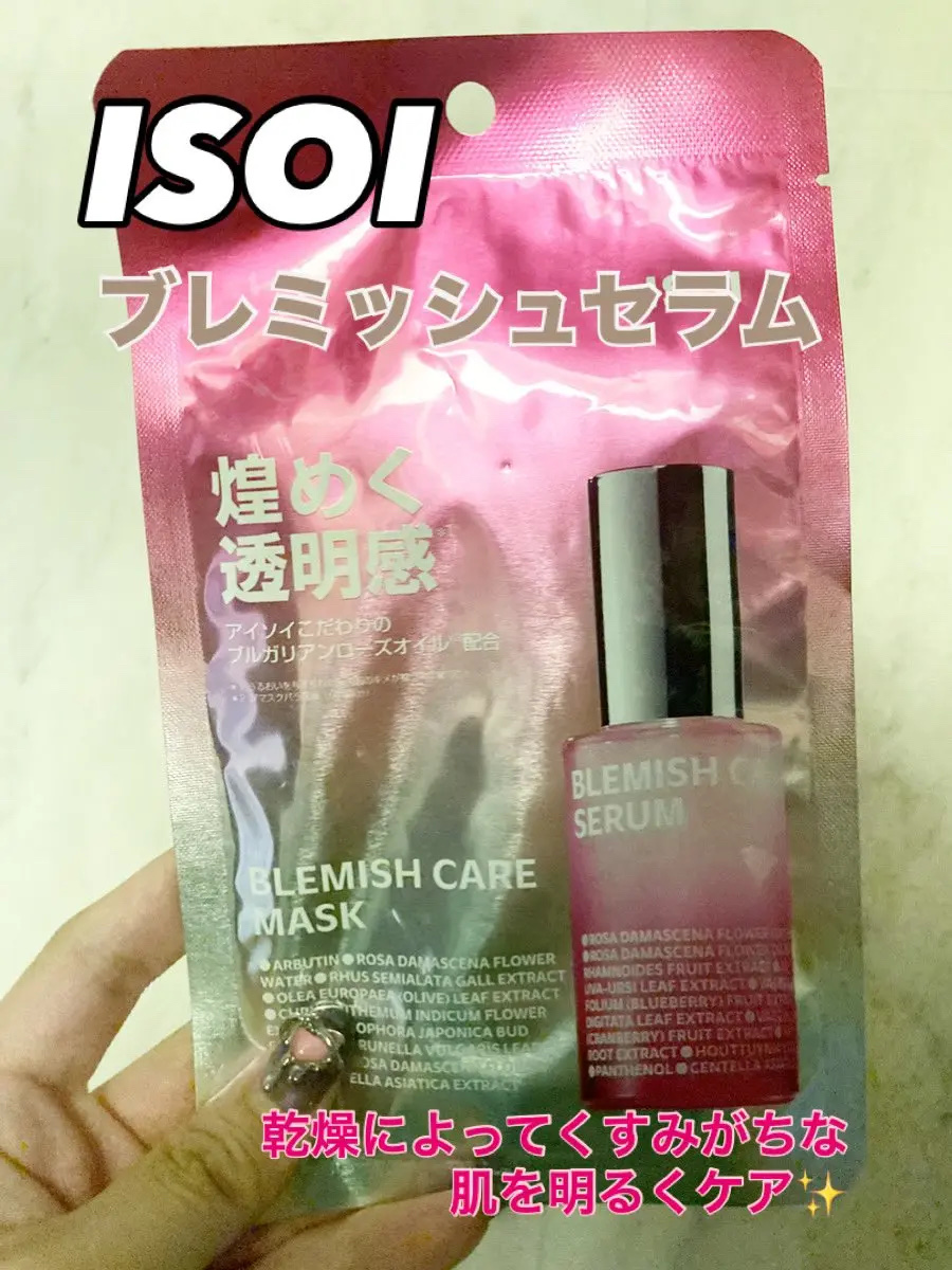 ISOIブレミッシュケアマスク薄すぎないシートに、ほんの少しとろみはありますがさらっとしていて、さっぱりめの美容液がひたひたになっていました少しお肌がごわついている時に使用しましたが(おそらく乾燥によるごわつき)パックした後はごわつきが消えて...