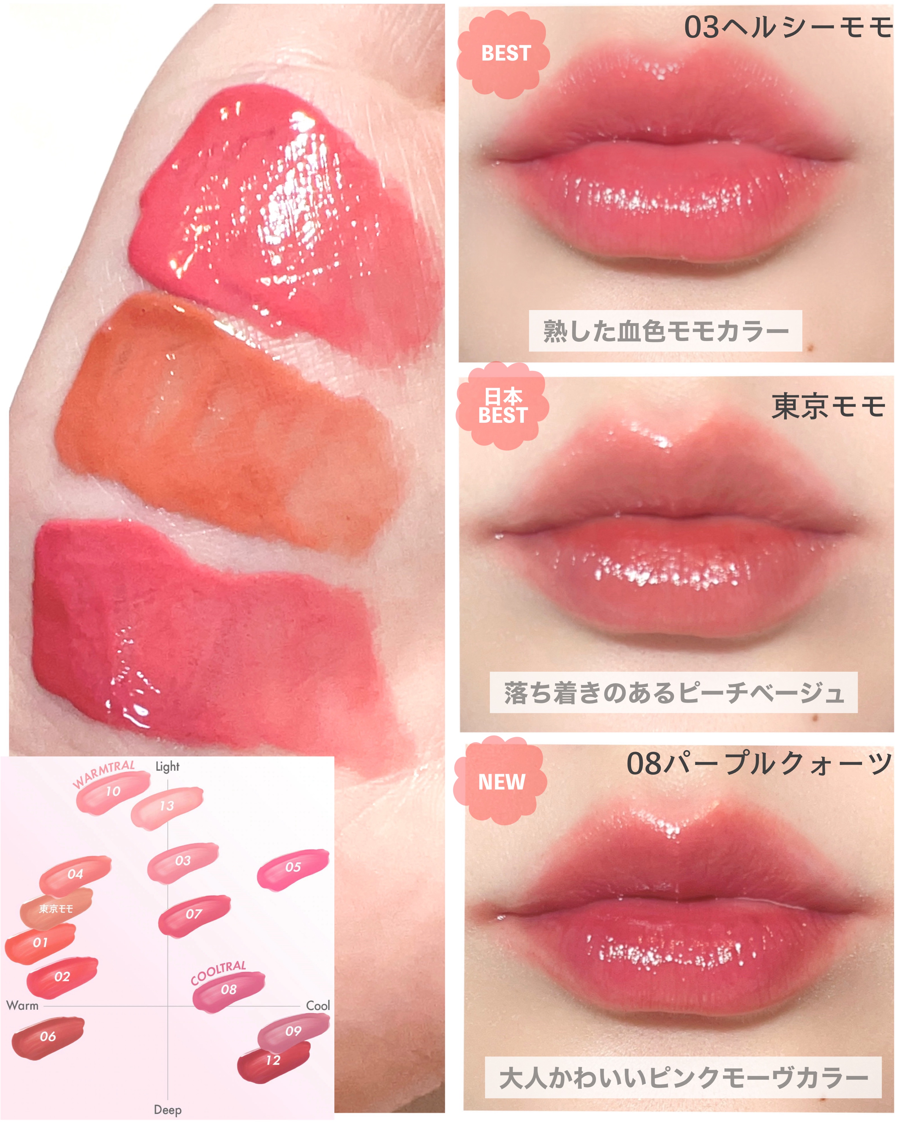 - <01 ラヴィアンコーラル> 精製水、ジフェニルジメチコン、リンゴ酸ジイソステアリル、ビスジグリセリルポリアシルアジペート-2、水添ポリイソブテン、ジグリセリン、セチルPEG/PPG-10/1ダイメチコン、DPG、イソステアリン酸ソルビタン、ポリソルベート60、オクチルドデカノール、ペンチレングリコール、グリセリン、二酸化チタン、セテアレス-20、アクリル酸ヒドロキシエチル/ナトリウムアクリロイルジメチルタウリン酸共重合体フェノキシエタノール、スクアラン、ポリグリセリン-3、香料、ステビオシド、黄色4号、エチルヘキシルグリセリン、赤色227号、トリ(カプリル/カプリン酸)グリセリル、赤色104号(1)、トコフェリルアセテート、黄色5 号、ブリリアントブルーFCF、マンゴー果実エキス、リンゴエキス <06 フィグデュー> 水、ジフェニルジメチコン、リンゴ酸ジイソステアリル、ポリアシルアジピン酸ビス-ジグリセリル-2、水添ポリイソブテン、ジグリセリン、セチルPEG/PPG-10/1ジメチコン、ジプロピレングリコール、イソステアリン酸ソルビタン、ポリソルベート60、オクチルドデカノール、ペンチレングリコール、グリセリン、二酸化チタン(CI) 77891)、セテアレス-20、アクリル酸ヒドロキシエチル/アクリロイルジメチルタウリンナトリウムコポリマー、スクワラン、フェノキシエタノール、ポリグリセリン-3、香料、ステビオシド、赤28(CI 45410)、黄6(CI 15985)、黄5(CI 19140)、エチルヘキシルグリセリン、レッド 33 (CI 17200)、カプリル酸/カプリン酸トリグリセリド、酢酸トコフェロール、ブルー 1 (CI 42090)、Mangifera Indica (マンゴー) 果実エキス、Pyrus Malus (リンゴ) 果実エキス <12 日曜日> 水、ジフェニルジメチコン、リンゴ酸ジイソステアリル、ビスジグリセリルポリアシルアジペート-2、水添ポリイソブテン、ジグリセリン、セチルPEG/PPG-10/1ジメチコン、DPG、イソステアリン酸ソルビタン、ポリソルベート60、オクチルドデカノール、ペンチレングリコール、グリセリン、セテアレス-20、(アクリル酸ヒドロキシエチル/アクリロイルジメチルタウリンNa)コポリマー、フェノキシエタノール、スクワラン、ポリグリセリン-3、ステビオシド、香料、エチルヘキシルグリセリン、トリ(カプリル酸/カプリン酸)グリセリル、酢酸トコフェロール、マンゴー果実エキス、リンゴ果実エキス、酸化チタン、酸化鉄、黄4、赤227、赤104(1)、黄5、青1 <【旧】02 漢江ブリーズ> 水、ジフェニルジメチコン、リンゴ酸ジイソステアリル、ポリアシルアジピン酸ビス-ジグリセリル-2、水添ポリイソブテン、ジグリセリン、セチルPEG/PPG-10/1ジメチコン、ジプロピレングリコール、イソステアリン酸ソルビタン、ポリソルベート60、オクチルドデカノール、ペンチレングリコール、グリセリン、二酸化チタン(CI) 77891)、セテアレス-20、アクリル酸ヒドロキシエチル/アクリロイルジメチルタウリンナトリウムコポリマー、フェノキシエタノール、スクワラン、イエロー6 (CI 15985)、ポリグリセリン-3、香料、ステビオシド、エチルヘキシルグリセリン、レッド33 (CI 17200)、レッド28 (CI 45410)、トリカプリル/カプリン酸グリセリド、酢酸トコフェロール、ブルー 1 (CI 42090)、Mangifera Indica (マンゴー) 果実エキス、Pyrus Malus (リンゴ) 果実エキス <【旧】05 ヒップジロー> 水、ジフェニルジメチコン、リンゴ酸ジイソステアリル、ポリアシルアジピン酸ビス-ジグリセリル-2、水添ポリイソブテン、ジグリセリン、セチルPEG/PPG-10/1ジメチコン、ジプロピレングリコール、イソステアリン酸ソルビタン、ポリソルベート60、オクチルドデカノール、ペンチレングリコール、グリセリン、二酸化チタン(CI) 77891)、セテアレス-20、アクリル酸ヒドロキシエチル/アクリロイルジメチルタウリンナトリウムコポリマー、スクワラン、フェノキシエタノール、イエロー6 (CI 15985)、ポリグリセリン-3、香料、ステビオシド、エチルヘキシルグリセリン、レッド33 (CI 17200)、カプリル酸/カプリン酸トリグリセリド、酢酸トコフェロール、ブルー 1 (CI 42090)、Mangifera Indica (マンゴー) 果実エキス、Pyrus Malus (リンゴ) 果実エキス <【旧】09 ソウル ソウル> 水、ジフェニルジメチコン、マレートジソステアル、ビスジグリセリルポリシルダイピン-2、水素化ポリイソブテン、ディグリセリン、セチルペグ/PPG-10/1ジメチコン、ジップロピレングリコール、ソルビトン等酸塩、ポリソルベ酸60、オクティロドデドカン、ペンシェルン、ペントリン酸塩、ペントリ酸塩、ペンシュレン 二酸化チタン (CI 77891)、アクリル酸ヒドロキシエチル/アクリロイルジメチルタウリン酸ナトリウムコポリマー、フェノキシエタノール、スクワラン、イエロー6 (CI 15985)、ポリグリセリン-3、香料、ステビオシド、エチルヘキシルグリセリン、レッド33 (CI 17200)、カプリル酸/カプリン酸トリグリセリド、酢酸トコフェロール、ブルー 1 (CI 42090)、Mangifera Indica (マンゴー) 果実エキス、Pyrus Malus (リンゴ) 果実エキス <【旧】10 朝イチジク> 水、ジフェニルジメ