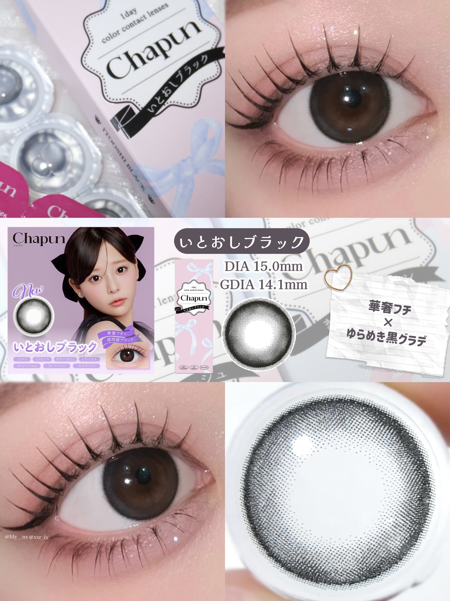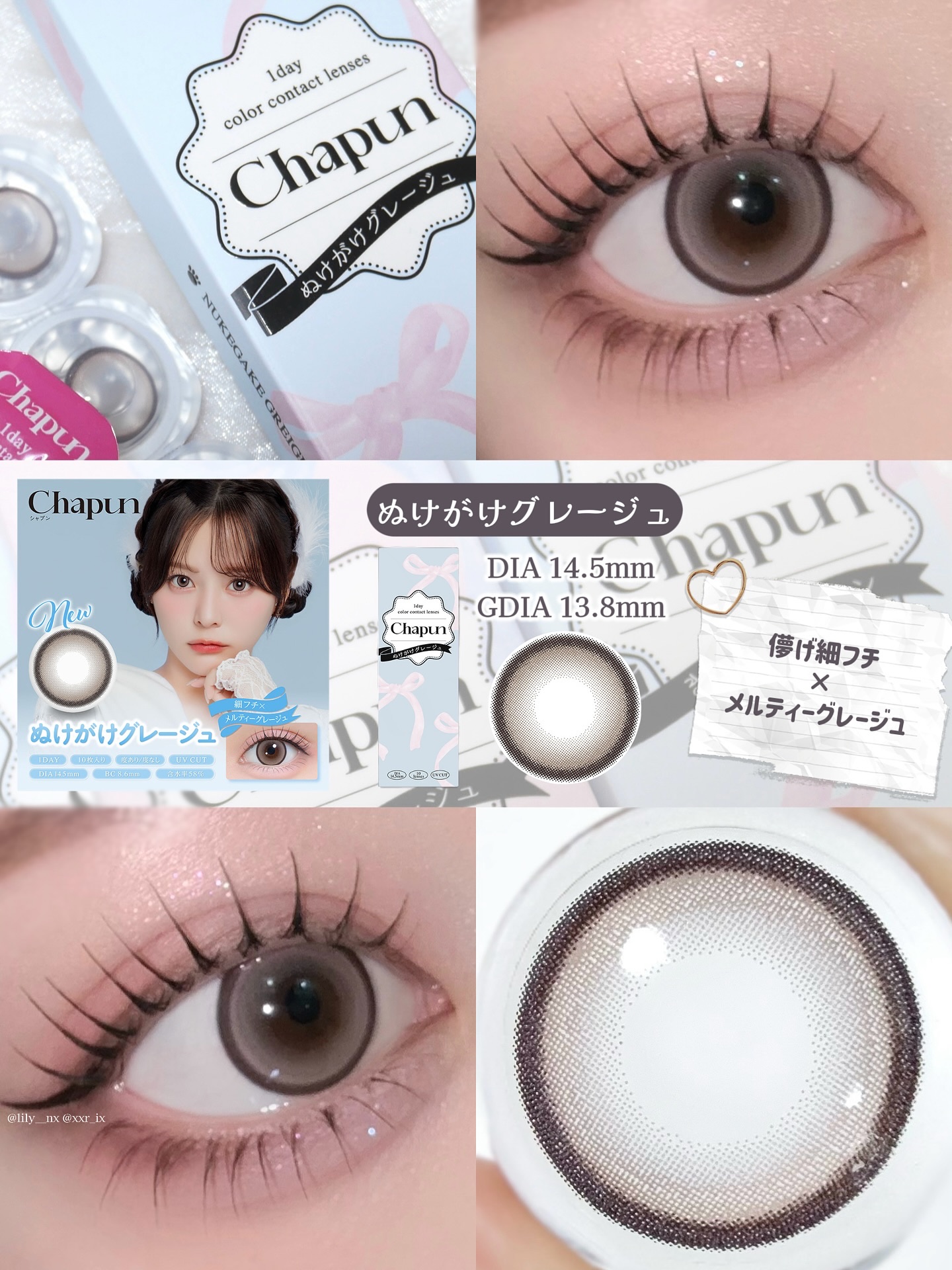 - 齊藤なぎさイメージモデル 可愛いを諦めないちょっぴり小悪魔な女の子たちに向けたカラコンブランド ■華奢フチ×透明感ブラック いとおしブラック DIA:15.0mm 着色直径:14.1mm ゆらめき黒グラデと華奢フチで小悪魔級に盛れちゃううるみレンズ♡ ■くっきり細フチ×きらめきブラウン きらゆめブラウン DIA:14.5mm 着色直径:14.0mm くっきり細フチときらめくちゅるんブラウンであどけなさあふれる ばぶみレンズ♡ ■太フチ×モテ盛れベージュ ずるモテベージュ DIA:15.0mm 着色直径:14.5mm 黒太フチと白っぽベージュでつくる夢中にさせちゃうずるモテレンズ♡ ■ぽってり黒太フチ×うるキラ水光グレー ときとめグレー うるみきらめくピタかわな瞳に♡ DIA:14.5mm 着色直径:14.0mm じんわり滲む極太フチとうるっと光るしずくグレーのカワイイ続く回らない盛れ水光レンズ♡ ■ぽってり黒太フチ×あまキラ水光ブラウン ときとめブラウン あまく輝くピタかわな瞳に♡ DIA:14.5mm 着色直径:14.0mm じんわり滲む極太フチとキラッと光る甘あまブラウンのカワイイ続く回らない盛れ水光レンズ♡ ■細フチ×メルティーグレージュ ぬけがけグレージュ DIA:14.5mm 着色直径:13.8mm 儚げカワイイ細フチとメルティーグレージュでみんなが振り向くぬけがけレンズ♡ カラーコンタクトレンズの不適正使用による眼障害の危険性等などがあります。 ●コンタクトレンズは高度管理医療機器です。不十分な洗浄・消毒など不適切なケアや、長時間・交換期間を超えた装用により、アレルギー性結膜炎、角膜感染症、角膜潰瘍等の重篤な眼障害が発生する危険性があります ●ご使用前に取扱説明書を確認してください 使用上の留意事項 ●眼科医院等を受診してからお求めください ●眼に異常を感じたら直ちにレンズ使用を中止し、お近くの眼科等で診察を受けてください ●医師の指示にしたがってご使用ください ●コンタクトレンズを装用する場合、自覚症状がなくても、眼科医院等での定期検査を受けてください ●レンズに不具合がある場合は使用しないでください