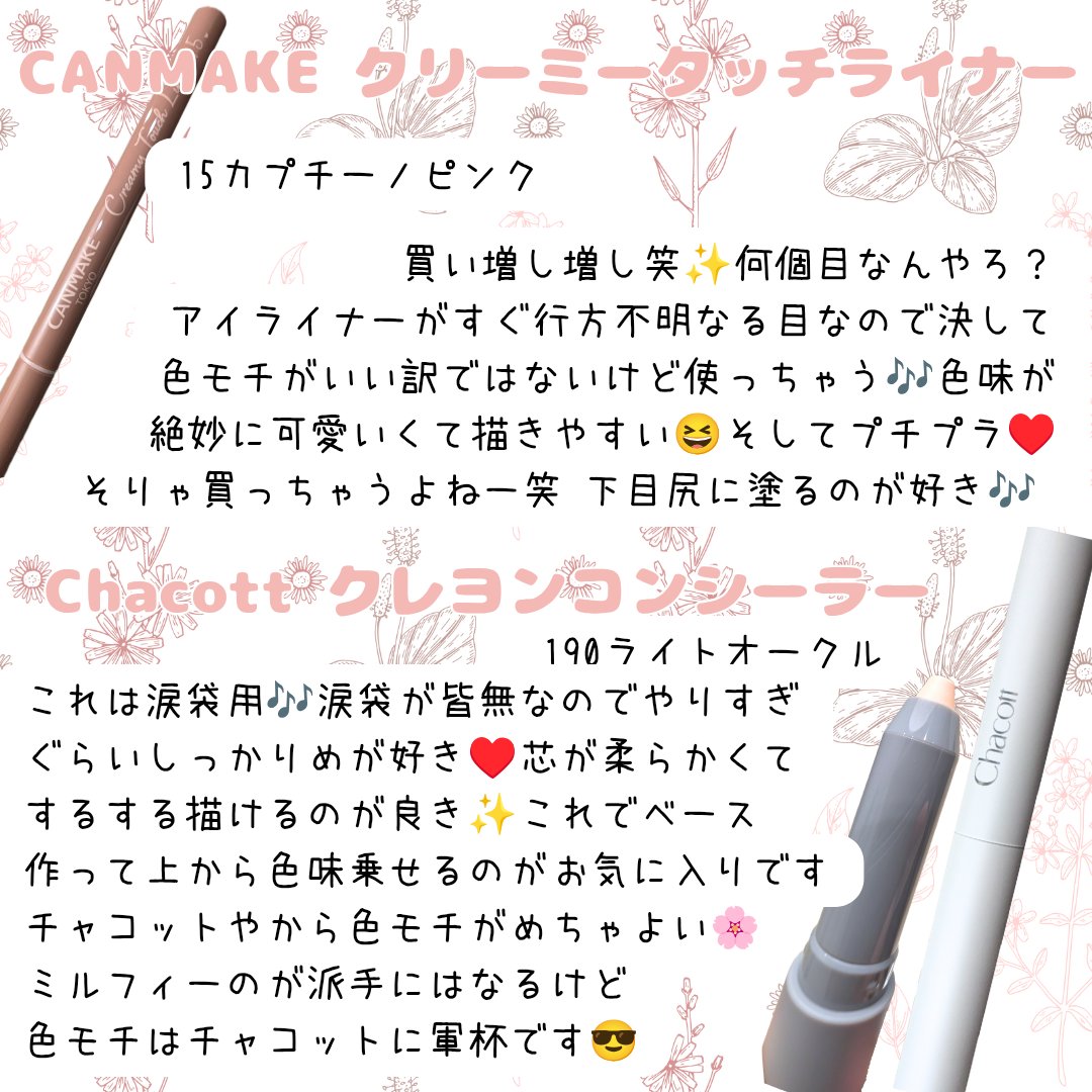アイライナーはヒロインメイクがいっちばん好き🩷 なぜなら落ちにくいから!! わたしドライアイのせいかどのアイライナー使っても目尻すぐどっか行くんですよ。 キャンメイクのクリームチーク、2個目なんですよ。 以前の投稿にも載せてるんですがペールライラックめちゃんこ可愛い!! ONE THINGはピンポイントなお肌の悩み対策に特化した化粧水で、鎮静ならドクダミやニンジン、ハリツヤならガラクトミセスやヒアルロン酸などたくさんの種類があります。
