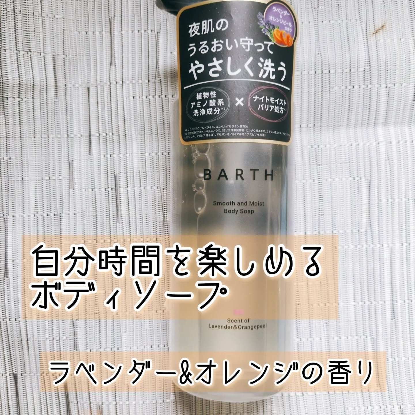 BARTHスムース&モイストボディソープ✎ナイトモイストバリア処方でうるおい守ってやさしく洗えるというナイト美容ボディソープ🫧ポンプタイプのクリアでシンプルなボトルデザイン🧴とろみの少ないサラサラとした液体のボディソープで、泡立ちはやや控えめ...